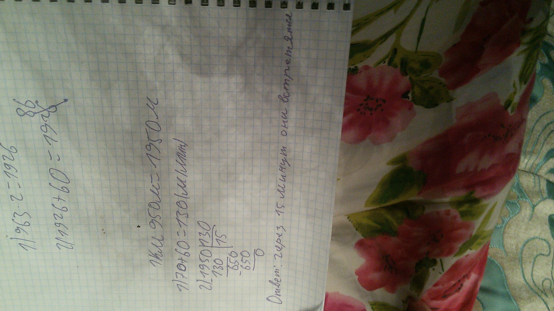 Найдем время, через которое они встретятся: 1950/130 = 15 мин.