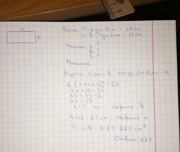 Периметр прямоугольника равен 6дм8см, одна из его сторон на 1дм6см меньше соседней стороны. Найди площадь прямоугольника. Надо сделать с шапкой! И быстро пож!