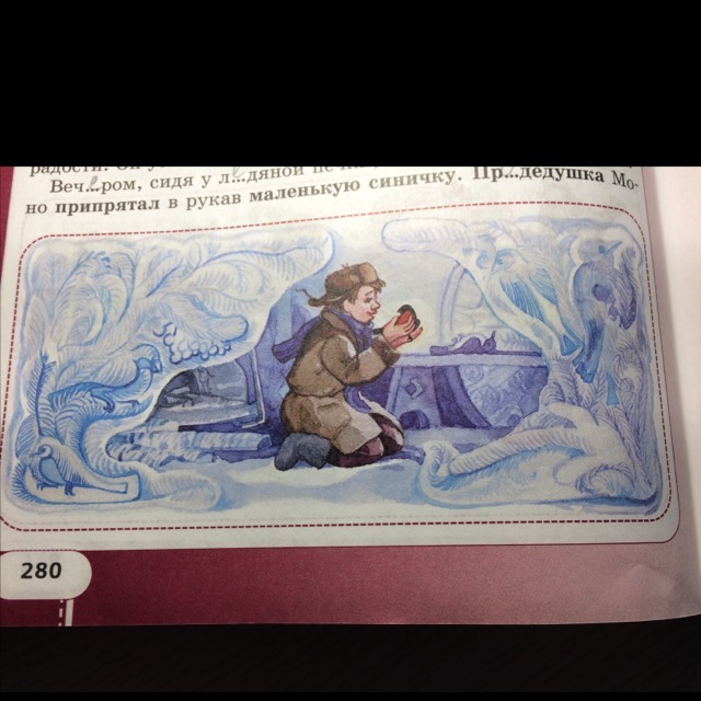 Один мальчик  потерял свою минску.Но один раз он ее нашел.Она была в комнате, в ней было так холодно что сеничка замерзла.Мальчик это заметил и аккуратно положил ее в рукав.А в комнате стоял стол, и везде были красивые узоры.Когда входишь в комнату  тоже были узоры виде животных.