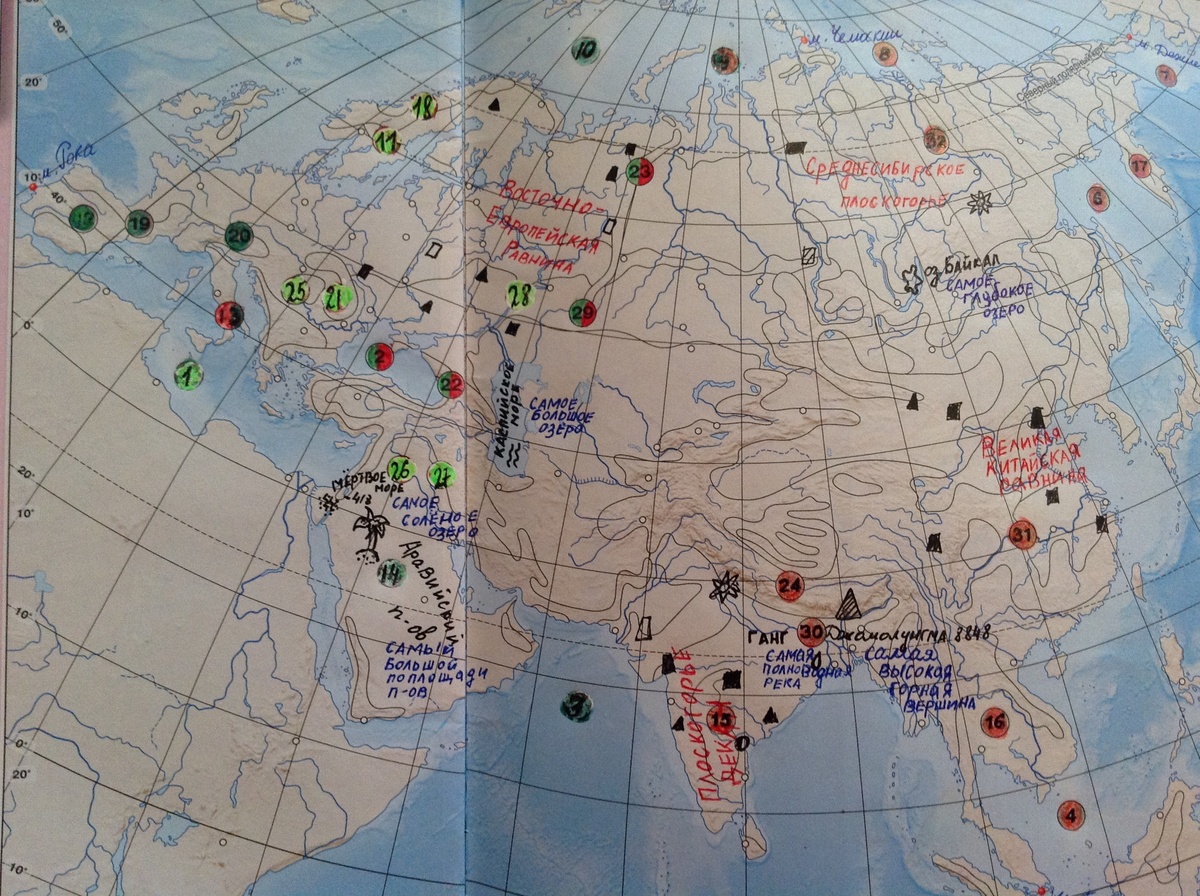Чтобы выполнить первое задание, соедините последовательно точки с номерами: 19 - 20 -21 -22 - 24. (эти номера стоят на Вашей карте). Это самые высокие отметки на материке Евразия.