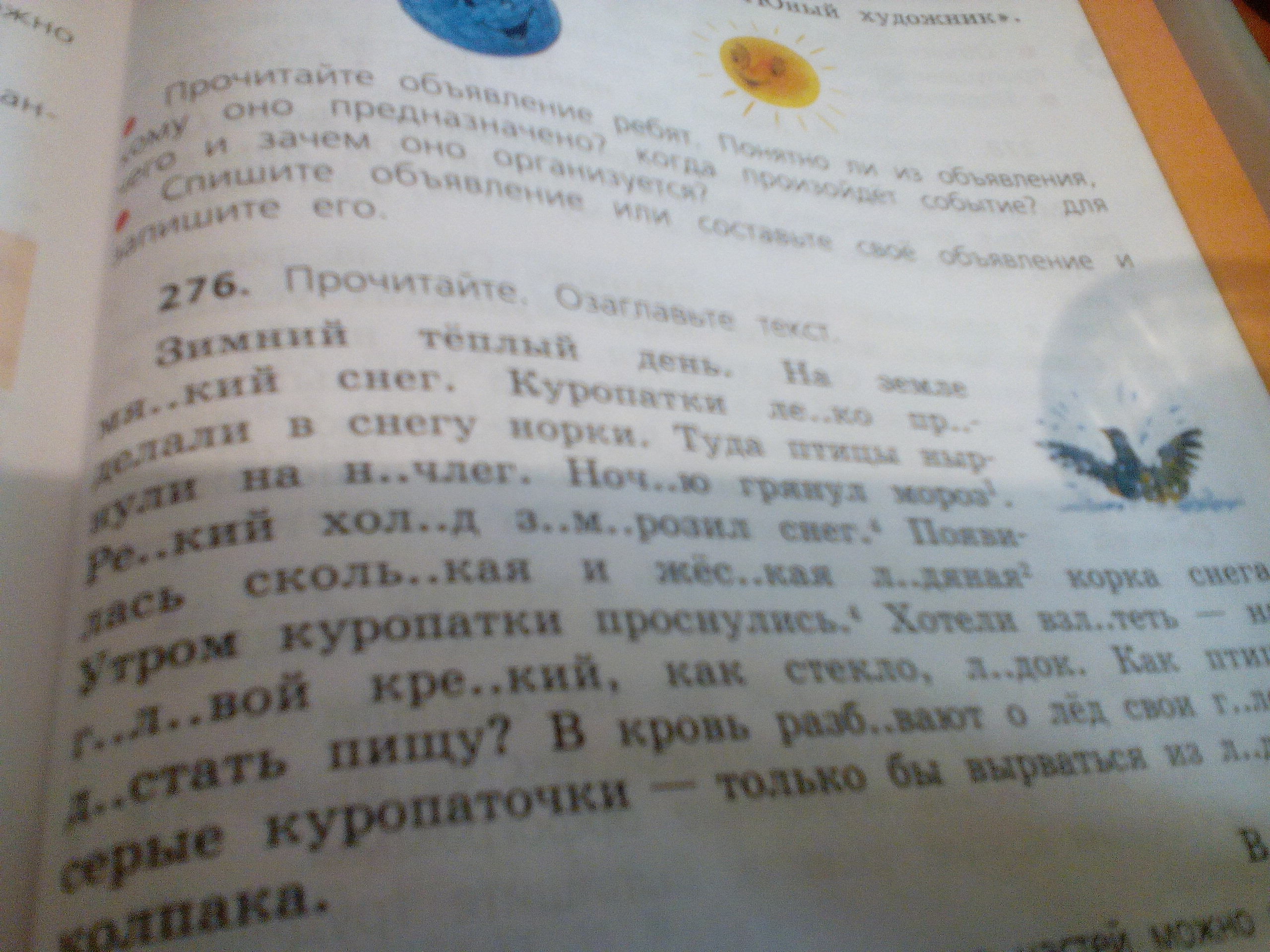 я думаю что тут 3 части. 1 часть говорится о теплом зимнем дне где только прилетели куропатки. 2 часть рассказывает о действии в ночное время и 3 часть рассказывает о том как маленькие птички думают выжить находясь в таком положении