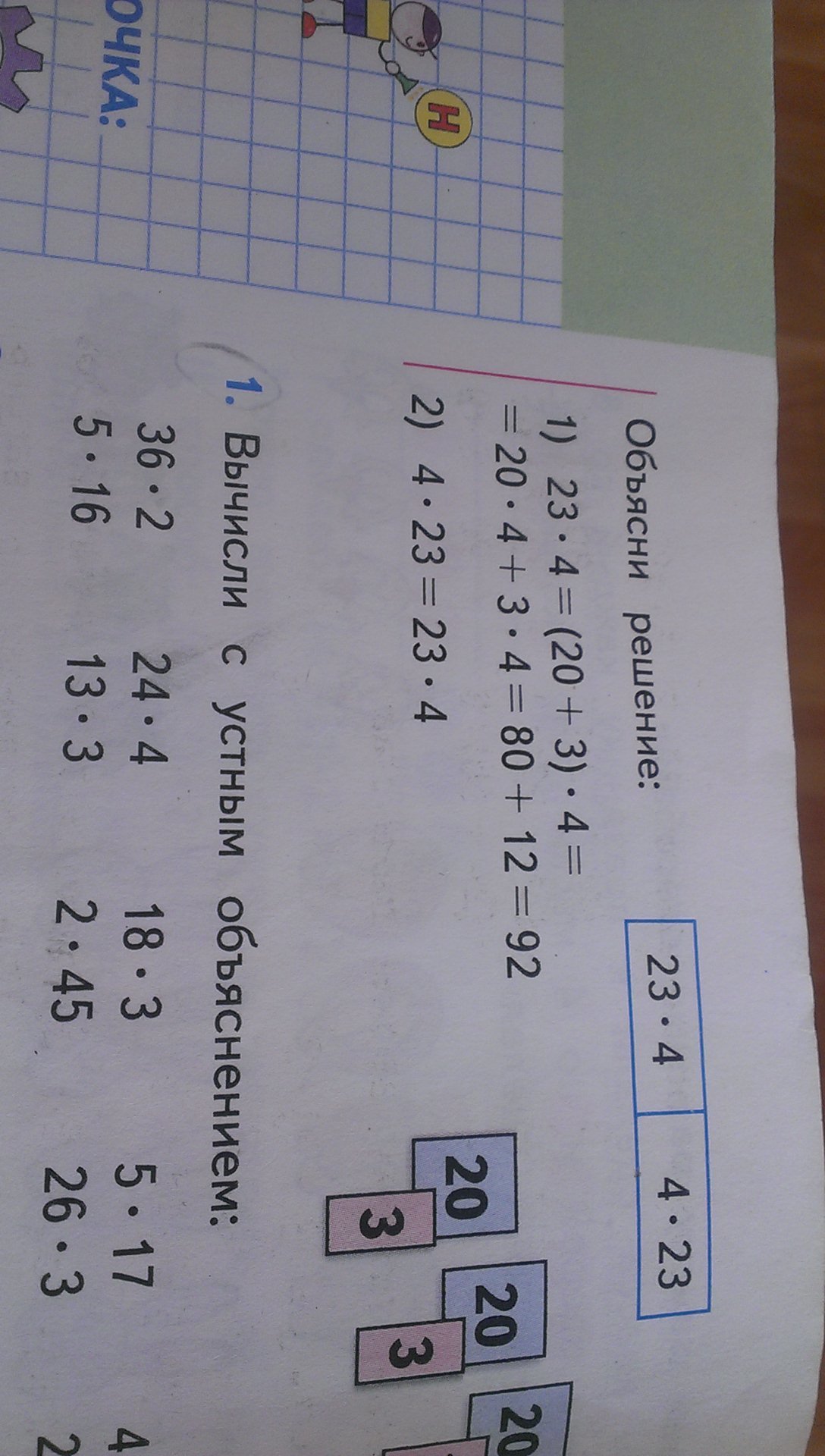 23 раскладываем как 20 и3 и фонтанчиком умножаем на 4 получается 80 + 12= 92