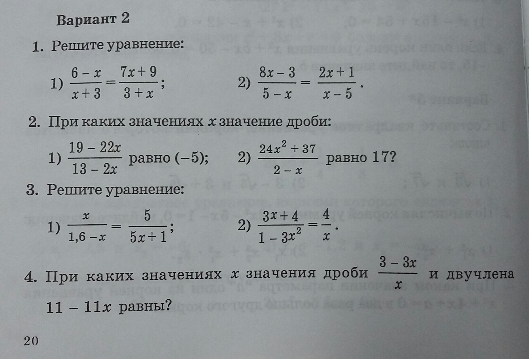 1. \ a) frac{6-x}{x+3}= frac{7x+9}{3+x} \ 6-x=7x+9 \ -8x=3 \ x= -frac{3}{8} \ \ b) frac{8x-3}{5-x} = frac{2x-1}{x-5} \ frac{8x-3}{x-5}=- frac{2x-1}{x-5} \ 8x-3=-2x+1 \ 10x=4 \ x= frac{4}{10}= frac{2}{5} \ \ 2. \ a) frac{19-22x}{13-2x}=-5 \ 19-22x=-5(13-2x) \ 19-22x=-65+10x \ -32x=-84 \ x= frac{84}{32}= frac{21}{8}