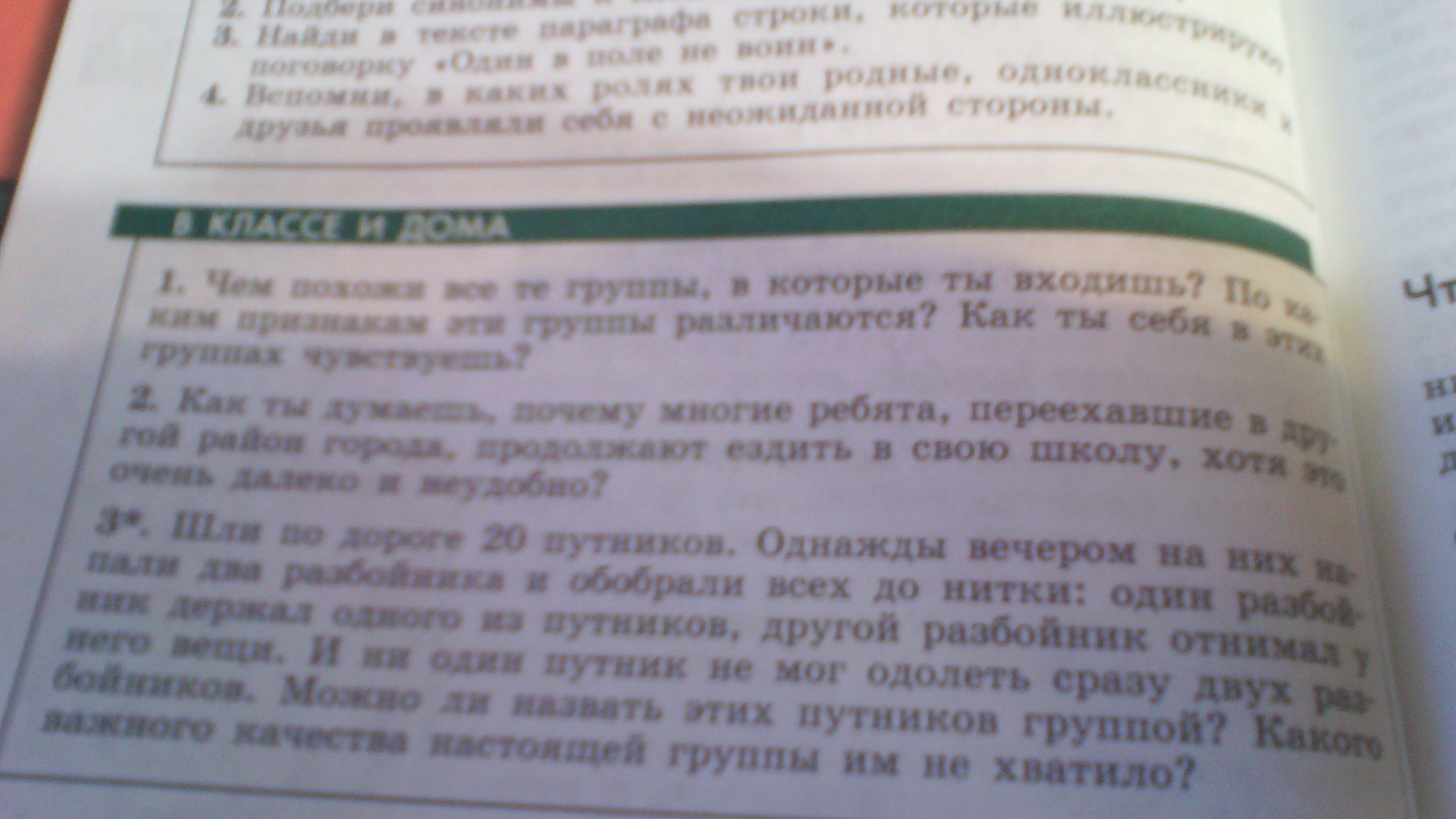 В группах можно чувствовать себя по разному. В семье ты будешь понимать, что ты кому то нужен,а в учебной группе так не будет. 2.Я думаю дело в том, что переход в новую школу вызывает некий страх, а в своей родной школе всё-таки привычнее, все знакомые, всё известно. К новому же нужно сначала привыкнуть. 3.группой можно назвать.им не хватило смелости и командного духа как я считаю,если бы они все вместе и сообща начали давать отпор разбойникам то у них бы это спокойно получилось,а так как у них не было командного духа и не хватило смелости то их обокрали.