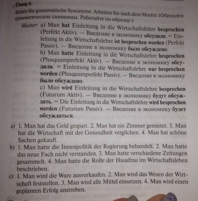 b) 1. Man hatte die Innenpolitik der Regierung behandelt. Обсуждали внутреннюю политику правительства. Die Innenpolitik der Regierung war behandelt worden. Внутренняя политика правительства обсуждалась.