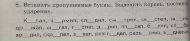-Коп-Ал, -корм-Ил, -след-Ил, -смотр-Ел, -свист-Ел, -жал-Ел, -дрож-Ал, -шаг-Ал, -гост-Ил, -дар-Ил, -пляс-Ал,-бол-Ел, -слаб-Ел, -вред-Ил, -скрип-Ел, -зев-Ал, раз-гляд-Ел, разъ-ясн-Ил, -вид-нЕлись.