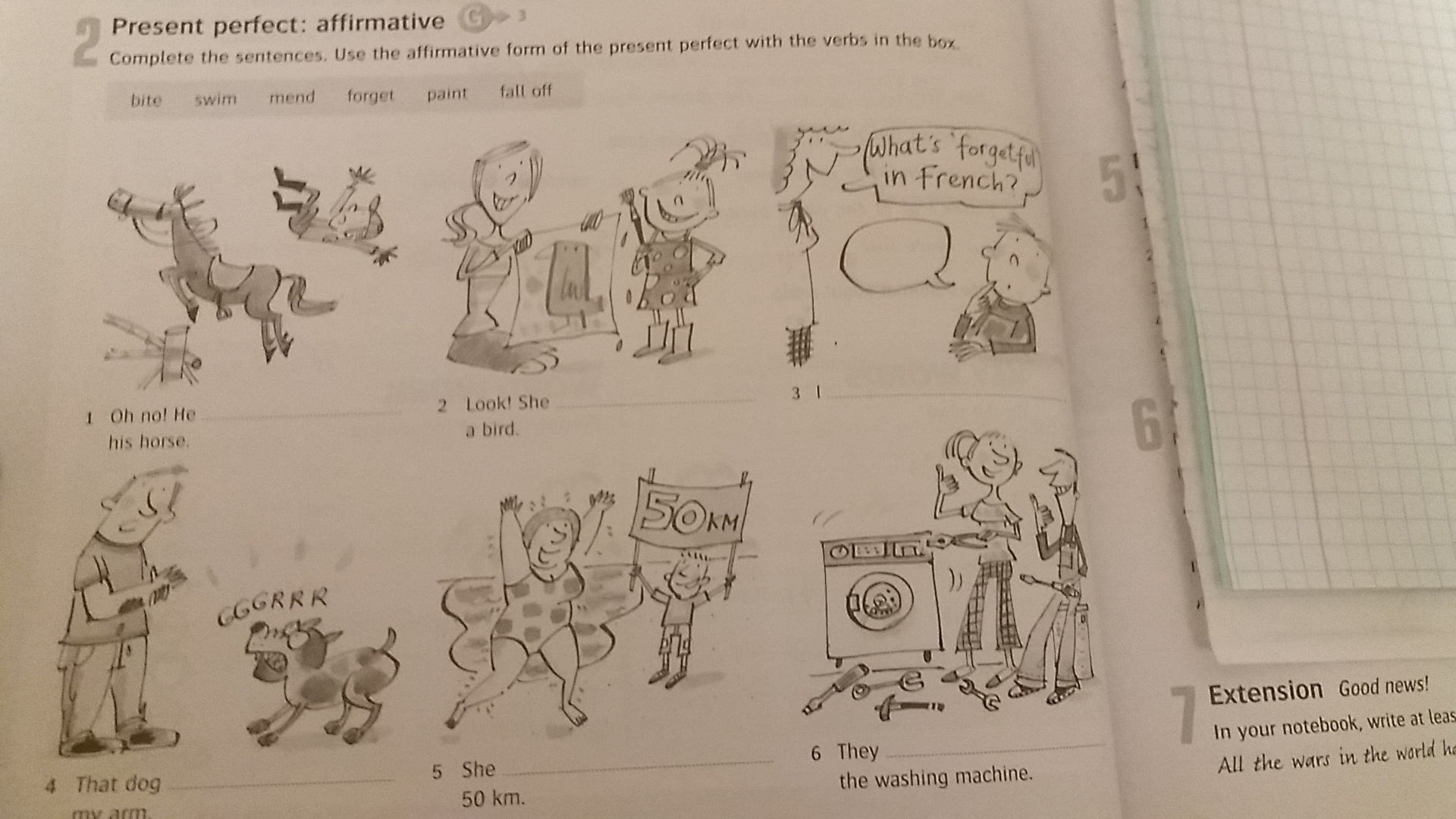 1-fall off 2-paint 3-foget 4-bite 5-swim 6-mend