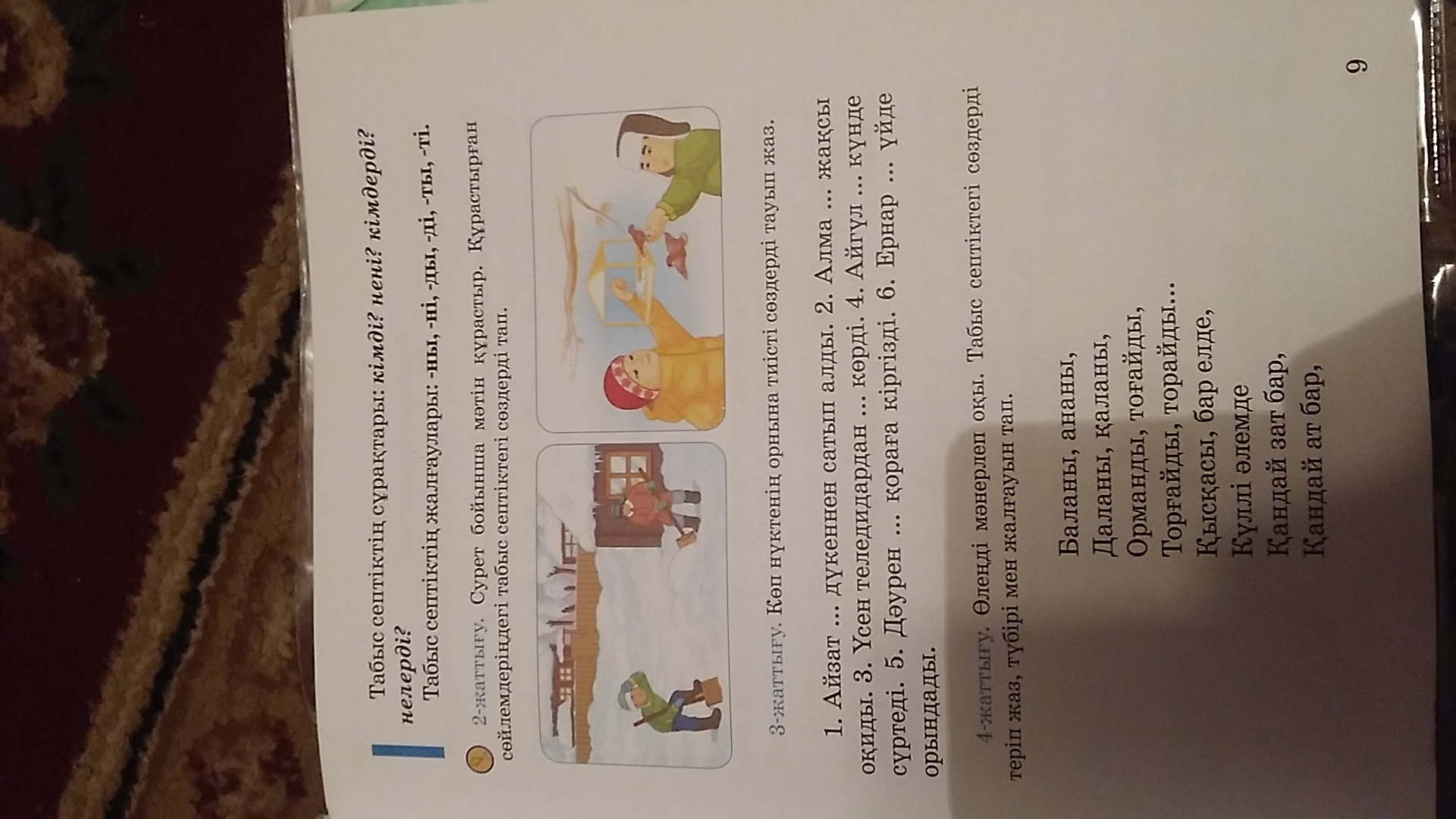 қыс айы. шаруа өте көп. ересектердің бәрі жұмыс жасауда. балалар да өздерінше көмек етуде. олар есік алдындағы жауған қарларды күрекпен тазалап , көңілдерін де көтеріп жүр. қыста қыстап қалған құстарға өз қолдарымен сәндеп тұрып, ұя жасауда. ол ұяға жем салып құстарға да көмек беруде