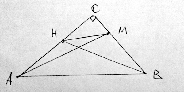 гипотенуза AB прямоугольного треугольника ABC равна x. Произвольная точка M на катете BC соединена с вершиной A, а точка H на катете AC соединена с вершиной B. найдите длину отрезка MH, если AM(в квадрате) +BH(в квадрате) =y(в квадрате)