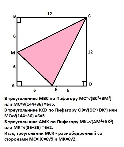 ПОЖАЛУЙСТА!!!!!!!В квадрате ABCD со стороной 12см точки M и K - середины сторон AB и AD соответственно. Найдите стороны треугольника MCK.