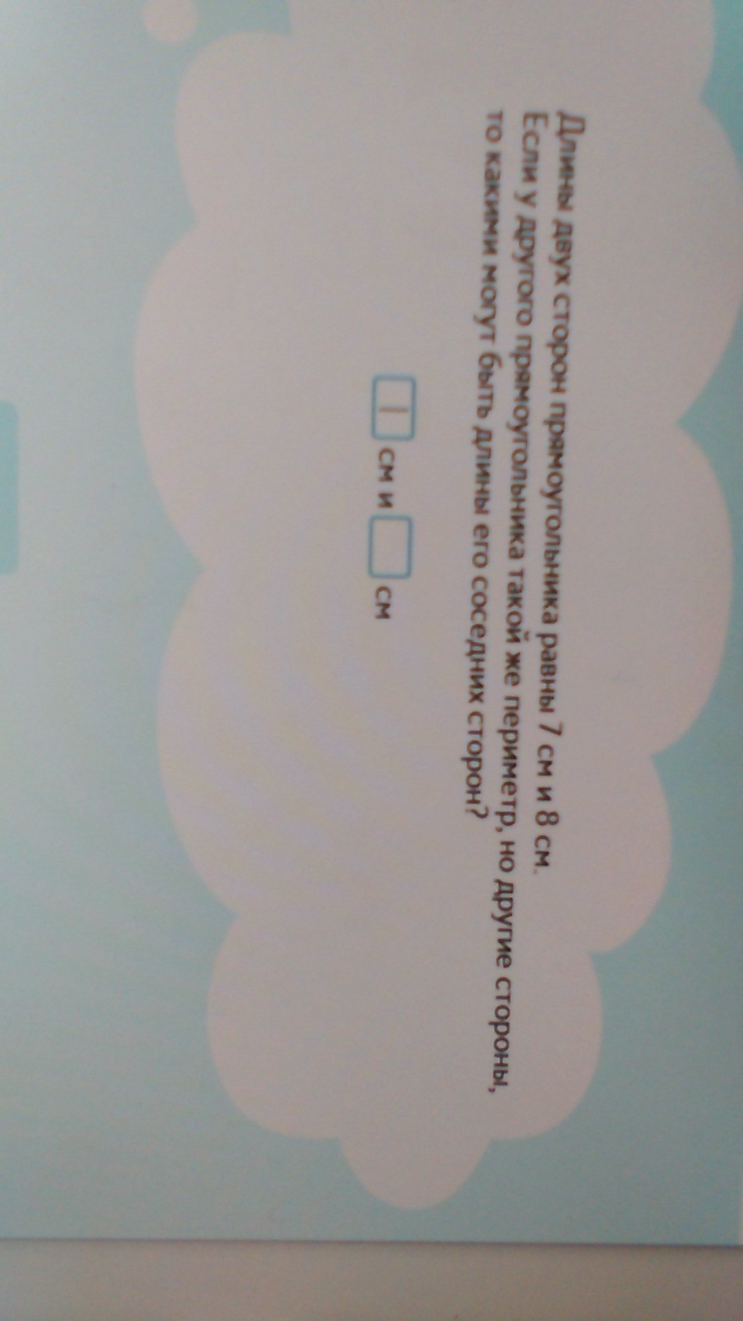 Р=2*(7+8)=30; Сумма двух сторон - 15. 15=1+14=2+13=3+12=4+11=5+10=6+9