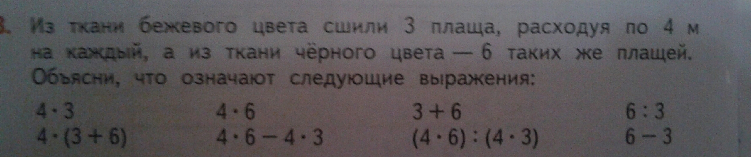 4*6-4*3-это на сколько больше ткани потратили на 6 черныхчем на 3 бежевых плаща