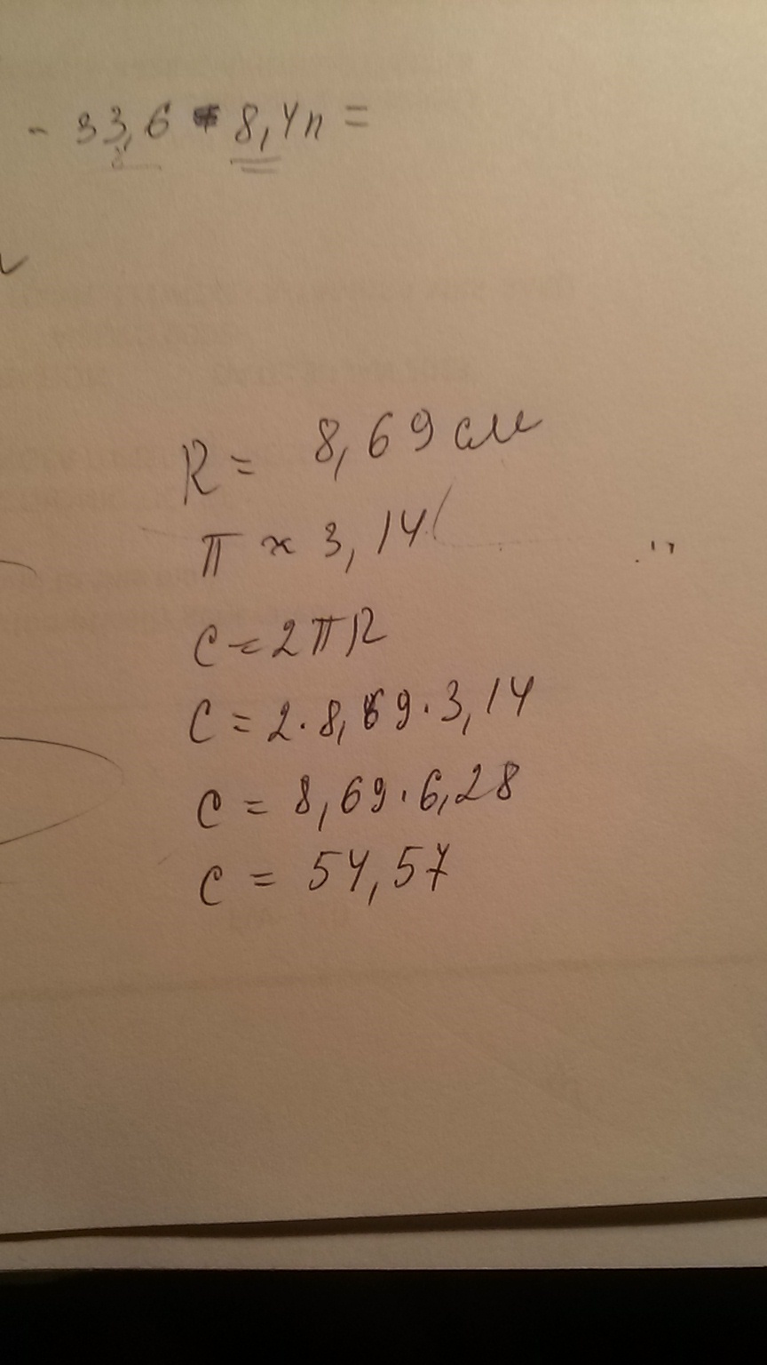 Радиус окружности равен 8,69 см. Значение числа π≈3,14.. Определи длину C этой окружности (с точностью до сотых). C= см