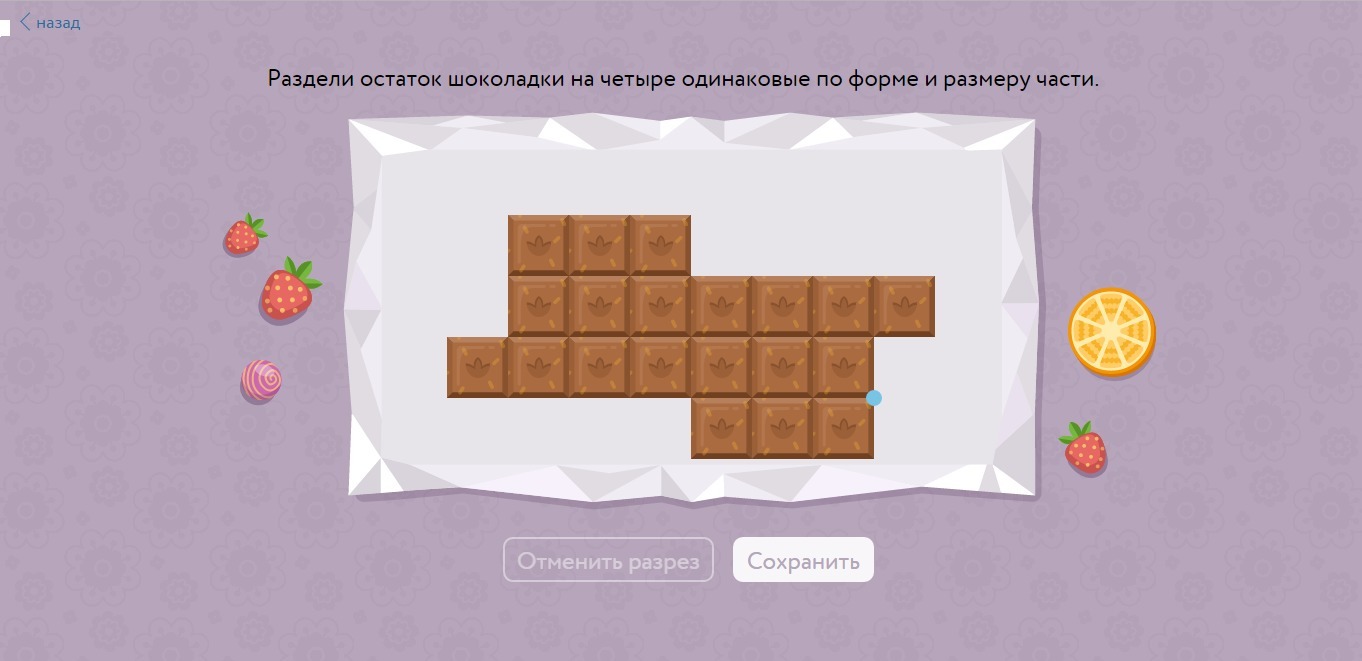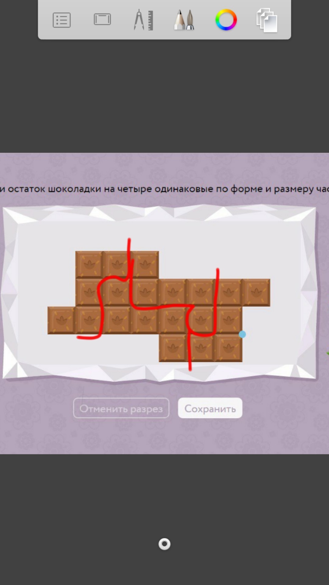 раздели остаток шоколадки на 4 ОДИНАКОВЫЕ по форме и размеру части картинкой,пожалуйста!