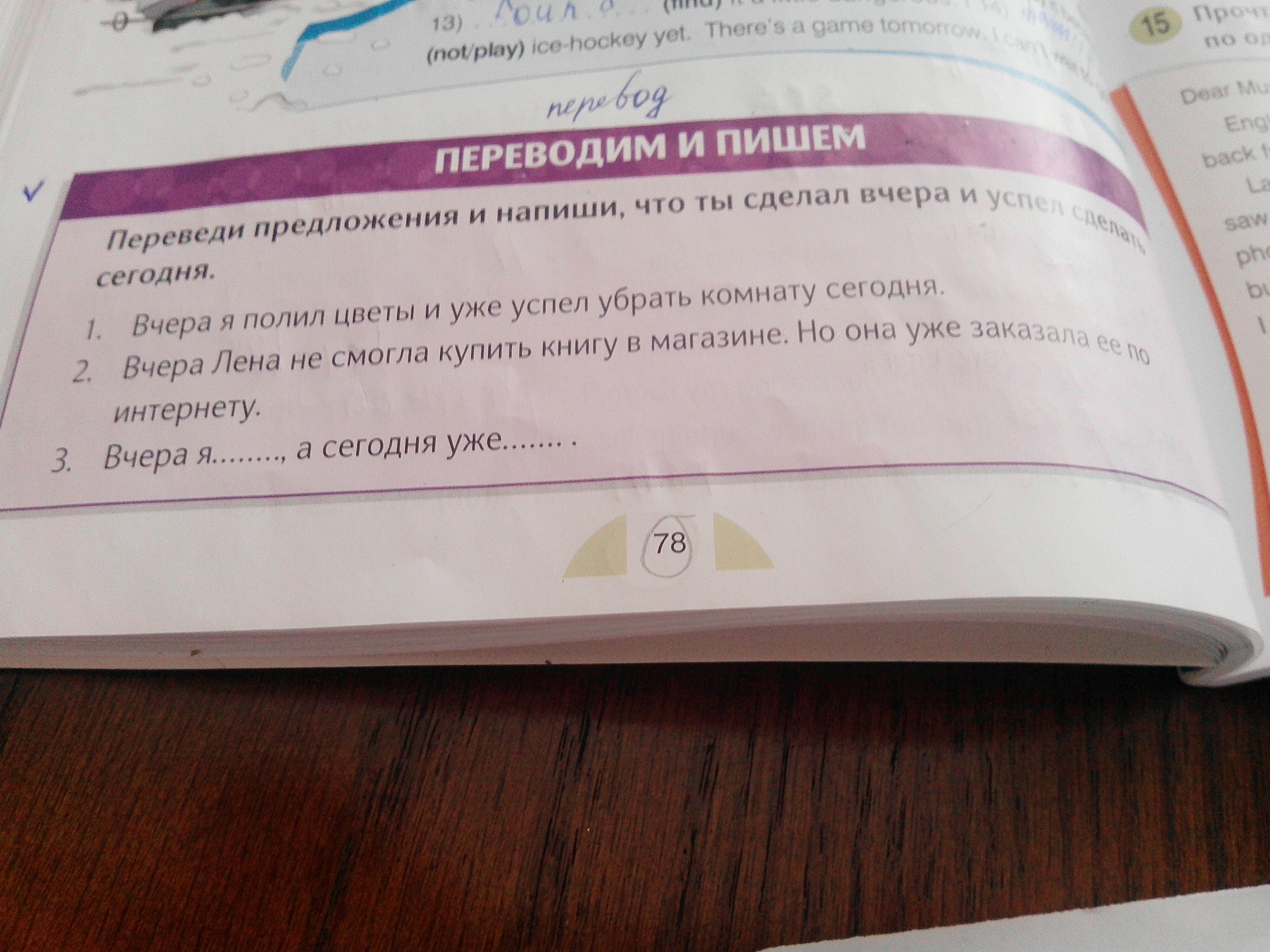 1.Вчера я полил цветы и уже успел убрать комнату сегодня. 2. Вчера лена не смогла купить книгу в магазине. Но она уже заказала её по интернету.3. Я вчера гулял,а сегодня делаю уроки.