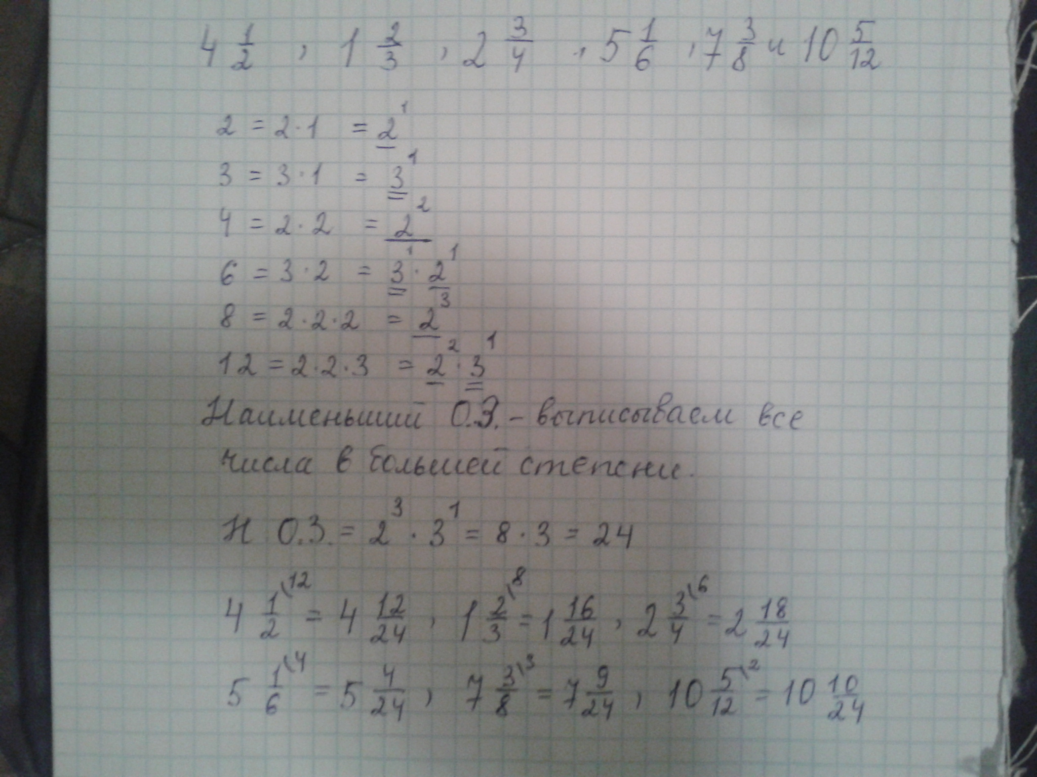 приведите смешанные числа 4 целых 1/2 ; 1 целая 2/3 ;2 целых 3/4; 5 целых 1/6; 7 целых 3/8 и 10 целых 5/12 наименьшему общему знаменателю