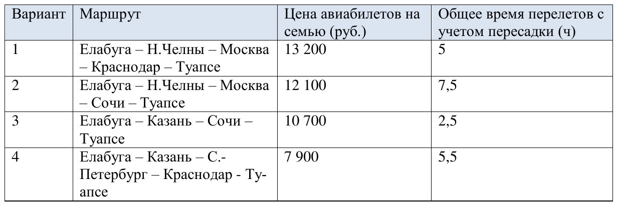 Семья Пермяковых из Елабуги планирует летом поехать к родственникам в Туапсе. Учитывая наличие маленького ребенка, семья хочет лететь самолетом и потратить на дорогу «от двери до двери» не более 10 часов. Ближайшие к Елабуге аэропорты – в Казани (в 210 км) и в Набережных Челнах (в 35 км). Ближайшие к Туапсе аэропорты – Краснодар (в 175 км) и Сочи (в 105 км). От дома до аэропорта и от аэропорта до дома родственников Пермяковы планируют ехать на такси (средняя скоростью 70 км/ч, средний тариф 17 руб./км). Пермяковы рассматривают следующие варианты (см. таблицу). Регистрация и посадка на первый рейс, получение багажа в аэропорту прибытия займут еще 1,5 часа. Какой из вариантов следует выбрать Пермяковым, если они хотят обязательно уложиться в 10 часов дороги и потратить на дорогу наименьшую возможную при этих условиях сумму денег? В ответ запишите номер выбранного маршрута.