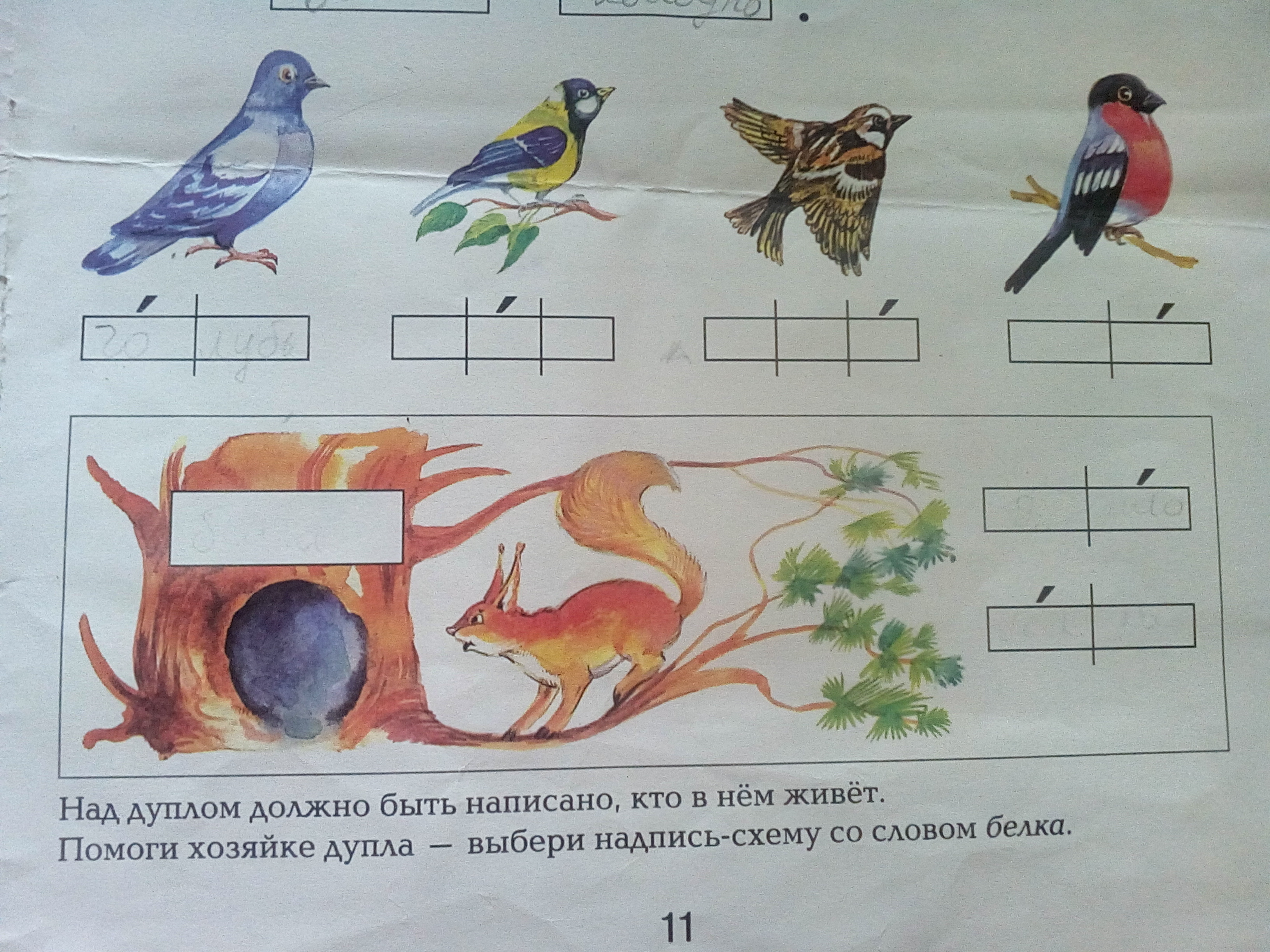 ГолУбь, (где большую букву в середине буду ставить там ударение) синИца, воробЕй, снегИрь, схема где написано белка вторая т.е. нижняя, пиши бЕлка с ударением на Е. #44