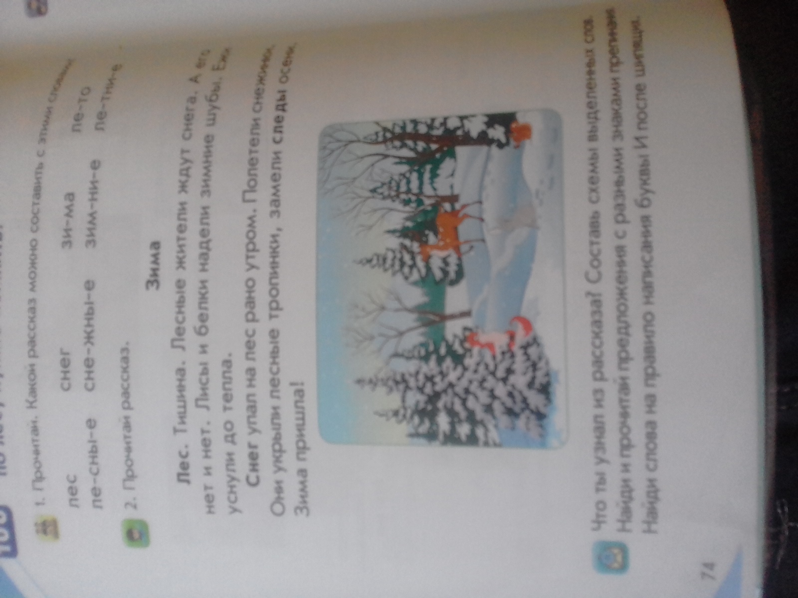 помогитеЛес. Тишина. Лесные жители ждут снега. А его нет и нет. Лисы и белки надели зимние шубы.Ежи уснули до тепла. Снег упал на лес рано утром. Полетели снежинки.Они украли лесные тропинки, замените следы осени.Зима пришла!