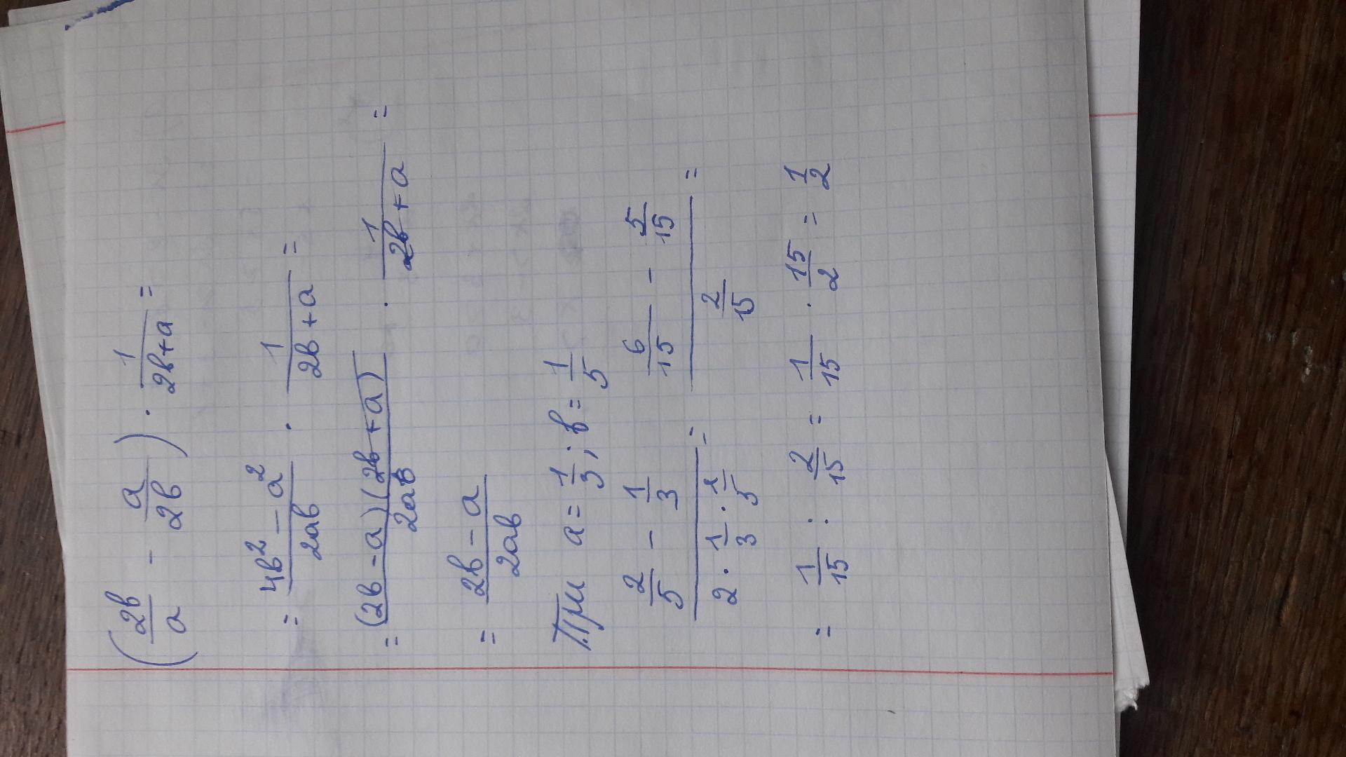 (2b/a - a/2b) * 1/(2b+a)= (2b*2b-a^2) * 1/(2b+a)= (2b-a)(2b+a)/(2b+a)=2b-a