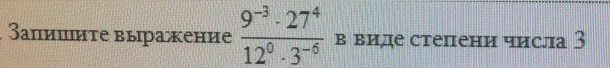 9⁻³27⁴/12⁰3⁻⁶= (3²)⁻³(3³)⁴/1*3⁻⁶=3⁻⁶3¹²3⁶=3¹²