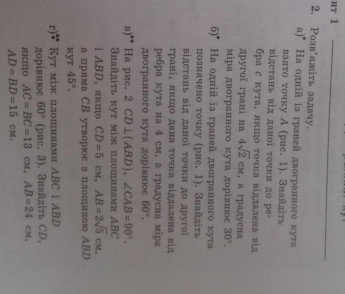 б) На одной из граней двугранного угла обозначена точка (рис.1). Найдите расстояние от данной точки до второй грани, если данная точка отдалена от ребра угла на 4 см, а градусная мера двугранного угла равна 60º