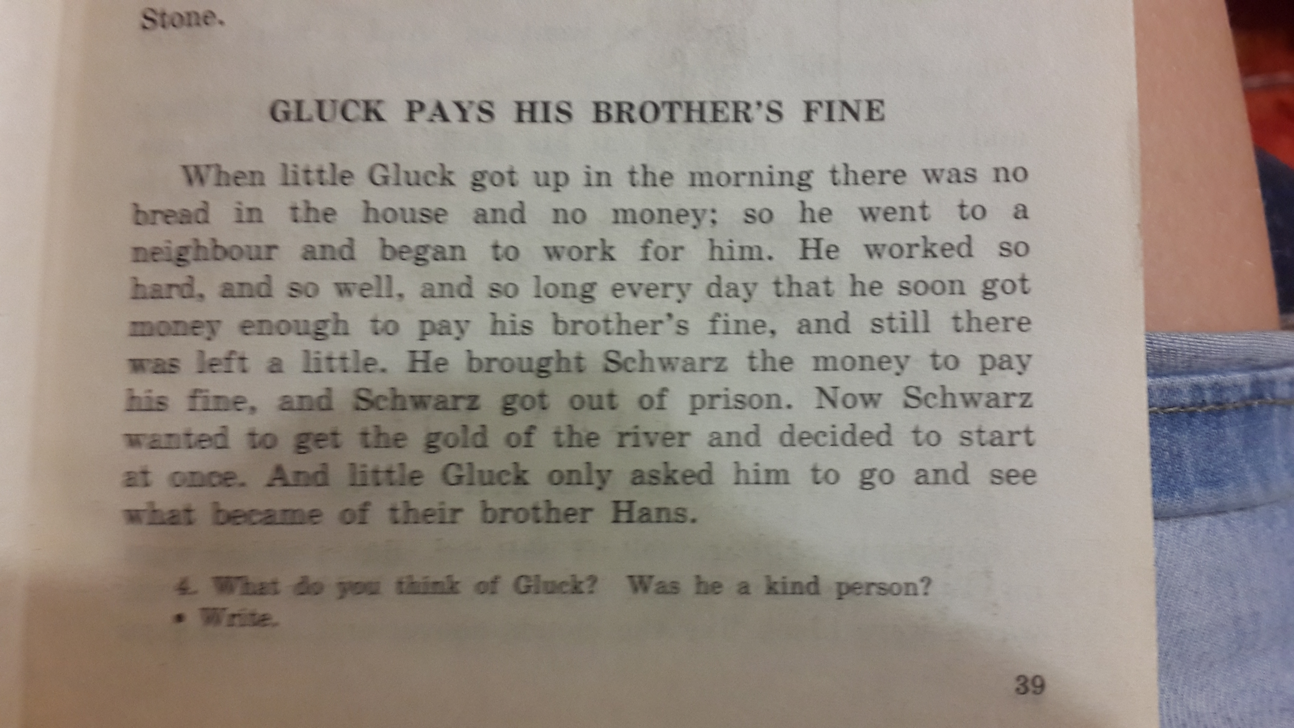Когда маленький Глюк встал утром, не было ни хлеба в доме, ни денег, поэтому он пошел к соседу и начал работать на него. Он работал так тяжело, и так хорошо, и так долго, каждый день, что вскоре получил достаточно денег, чтобы оплатить своему брату счастье(?), и еще оставалось немного. Он принес Шварцу денег, чтобы оплатить его штраф и Шварц вышел из тюрьмы. Теперь Шварц хотел получить реку золота и решил начать сразу. И маленький глюк только попросил пойти и посмотреть, что стало с их брат Гансом.