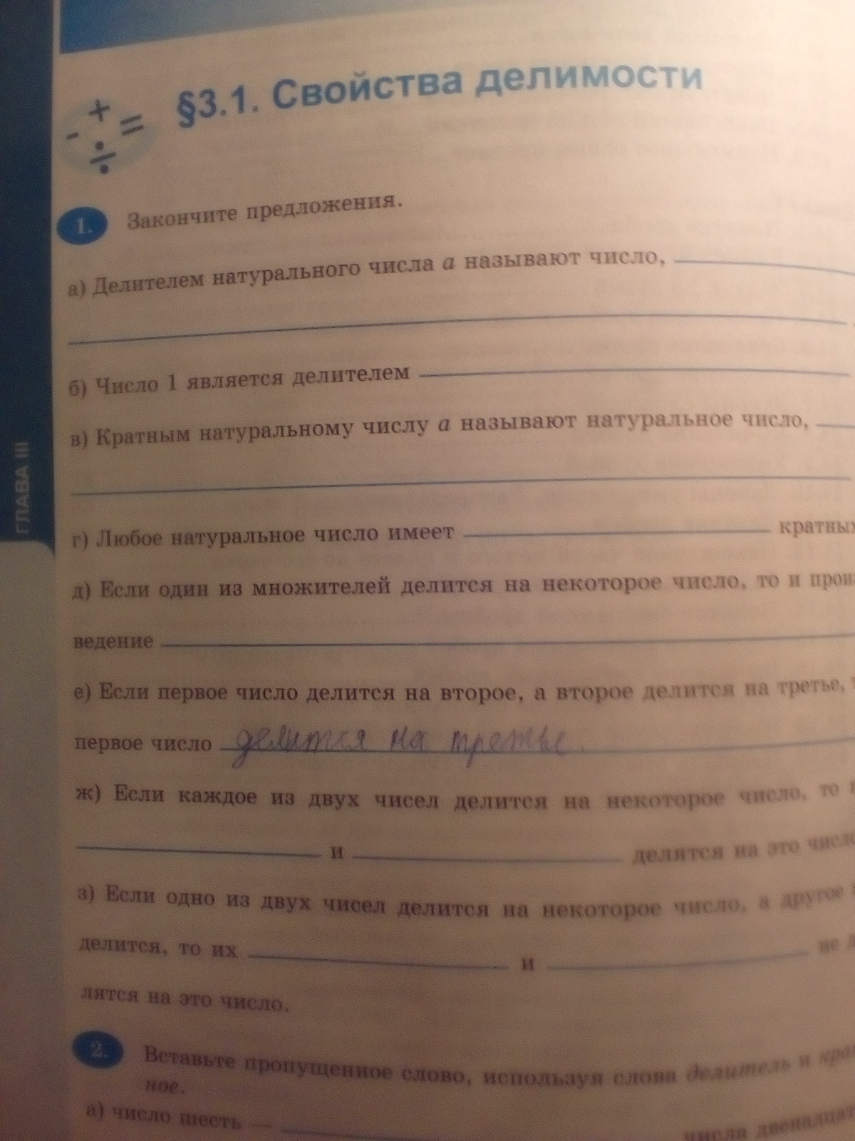 Кратным натуральному числу а называют натуральное число,которое делится на а без остатка. Если один из множителей делится на некоторое число,то и произведение делится на это число Если каждое из 2 чисел делятся на некоторое число то их сумма и разность делятся на это число. Если одно из 2 чисел делятся на некоторое число а другое не делится то тогда из сумма и разность не делятся на это число.