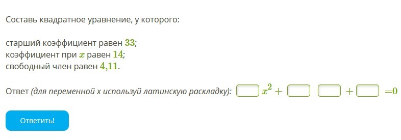 Ответ: 33 + 14 x + 4,11 = 0, уравнение записывается так - 33x^2 + 14x + 4,11 = 0