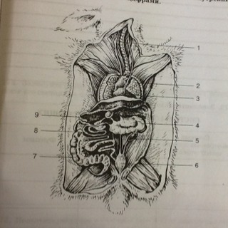 Рис. 195. Внутреннее строение кролика (самки): 1 — трахея; 2 — пищевод; 3 - сердце; 4 — легкие; 5—желудок; 6 — слепая кишка; 7 — печень; 8 — селезенка; 9 — тонкая кишка; 10 — поджелудочная железа; 11 — почка; 12 — толстая кишка; 13 — яичник; 14 — матка; 15 — яйцевод; 16 — мочевой пузырь