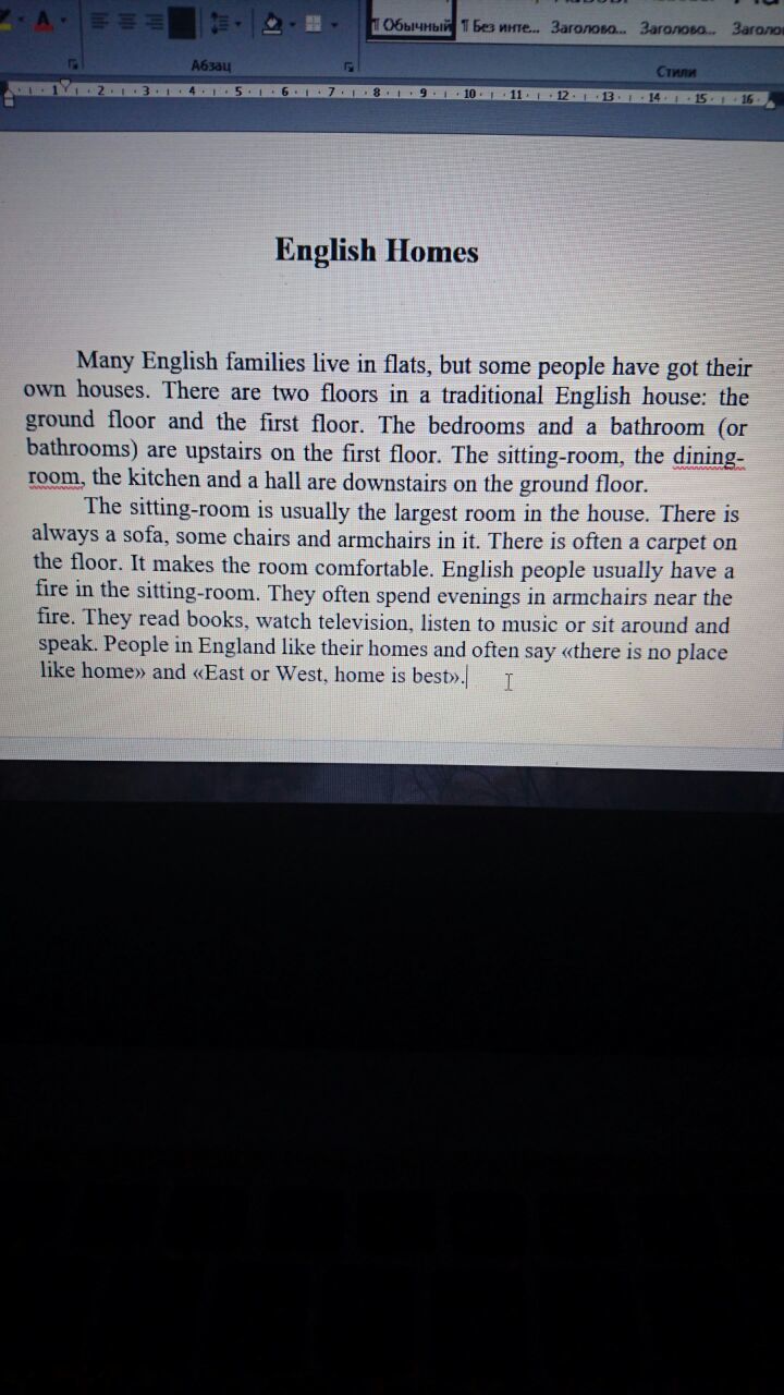 Много людей живут в квартирах, но некоторые имеют собственные дома. В традиционном английском доме есть два этажа : нижний этаж и первый этаж. Спальня и санузел ( или санузлы) находятся на первом этаже. А гостиная, столовая, кухня и хол находится на нижнем этаже. Обычно гостиная это самая большая комната в доме. здесь всегда есть диван, пару стульчиков и кресла. Здесь всегда есть ковры на полу. Это делает комнату комфортной. Обычно у англичан в гостиной есть камин. Они часто проводят вечера сидя в креслах возле камина. Они читают книги, смотрят телевизор,слушают музыку, или сидят рядом и разговаривают. Англичане любят свой дом и говорят " нет места лучше, чем дом" и "в гостях хорошо, а дома лучше"