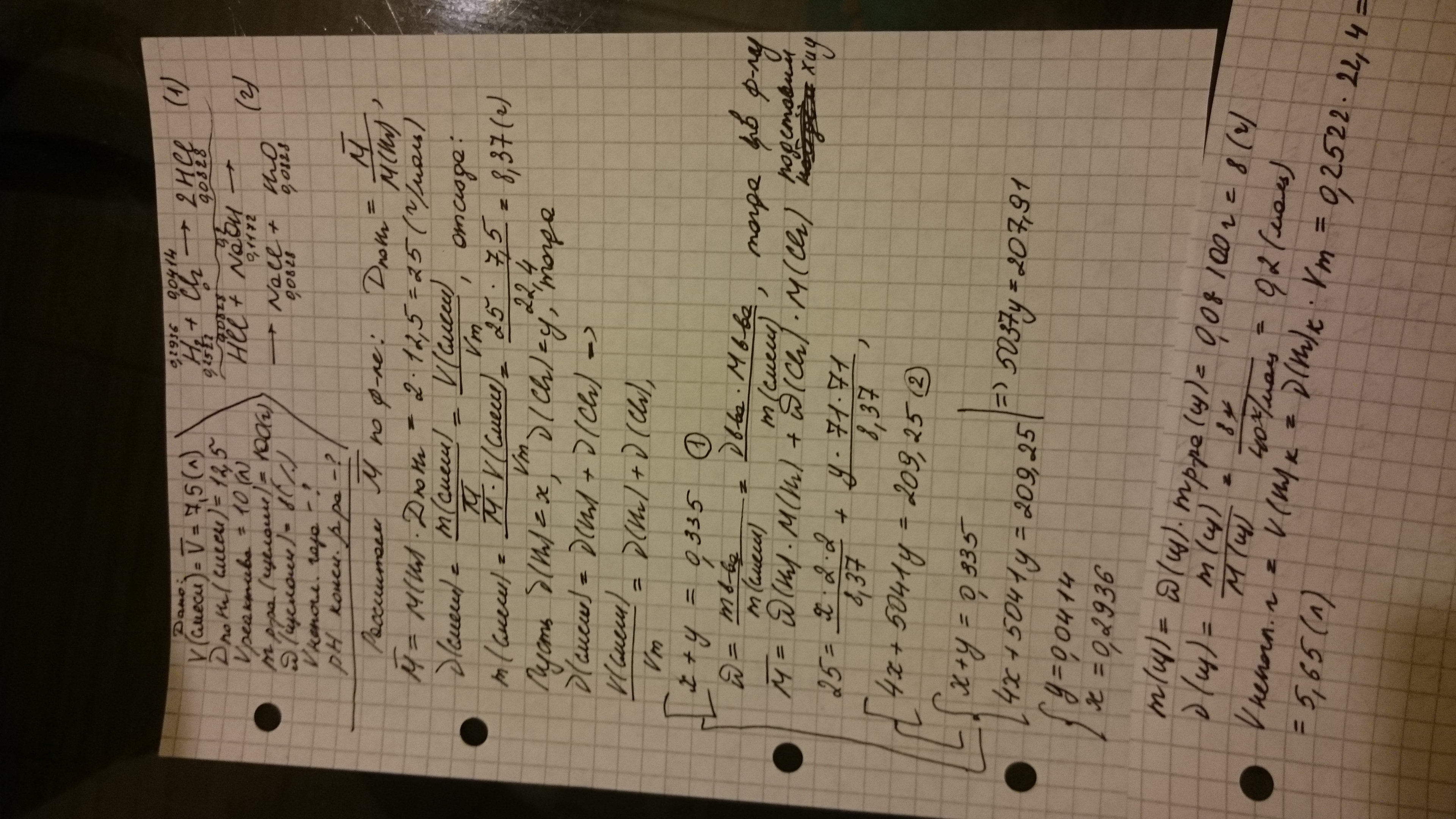 В реактор объёмом 10 л ввели 7.5 г газовой смеси H2 + Cl2, имеющей плотность по водороду = 12.5. Смесь облучили светом, прошла реакция соединения. Газовую смесь после реакции пропустили через водный раствор гидроксида натрия. Масса раствора 100 г, массовая концентрация w=8%. Определите объём (л, н.у.) непоглотившегося газа, и значение рН полученного раствора. В ответе дайте значение рН с точностью до целого.