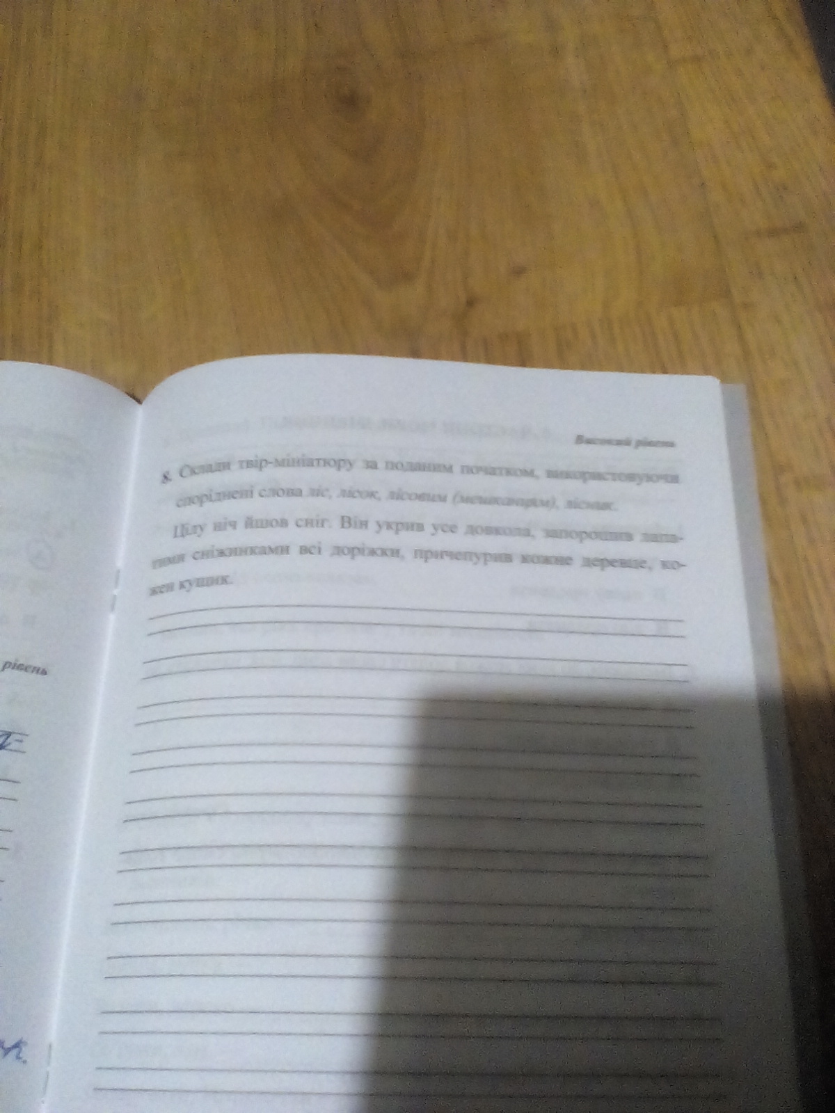 Тепер ліс здавався казковим світом, кришталеві віхи якого заворожували лісових мешканців. На сторожі таємничого лісу стояв лісник- могутній та чесний старець, що завжди оберігав чарівний лісок від негаразд. Зимовий ліс - це світ, де триває протистояння між силами природи. Білосніжні могутні дерева, припорошені сніжком, поодинокі галявини, вкриті білим килимом,— все дихає чарами.