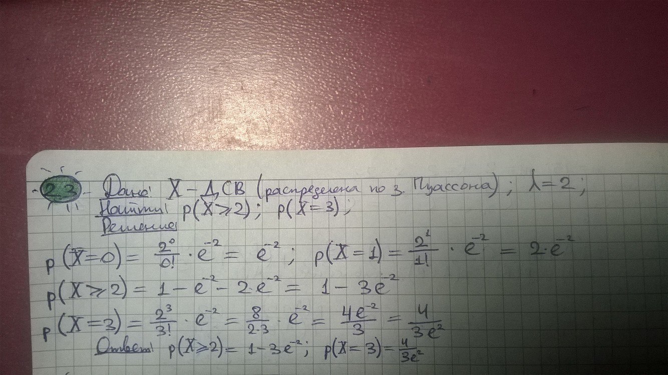2.3) ДСВ X распределена по закону Пуассона с параметром λ=2.Найти вероятности P(X⩾2), P(X=3)