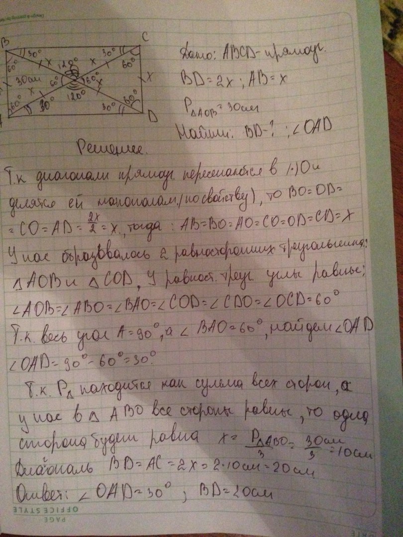 в прямоугольнике авсд диагональ ас в два раза больше стороны ав. найдите диагональ вд и угол оад, если периметр треугольника аов равен 30 см (о-точка пересечения диагоналей прямоугольника)