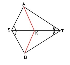 Треугольники АЅТ и ВЅТ равны по двум равным углам, прилегающим к общей стороне ЅТ ( 2-ой признак равенства), следовательно, стороны АЅ=ВЅ. В ∆ АЅК и ∆ ВЅК равны две стороны (АЅ=ВЅ и ЅК общая) и заключенные между ними углы. ∆ АЅК=∆ ВЅК по 1-ому признаку равенства, из чего следует ВК=АК