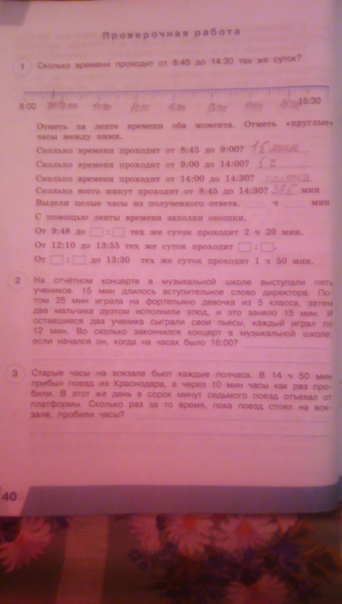 №2:Закончился концерт в 17.19 минут, так как 15+25+15+(12*2)=1 час 19 минут=79минут