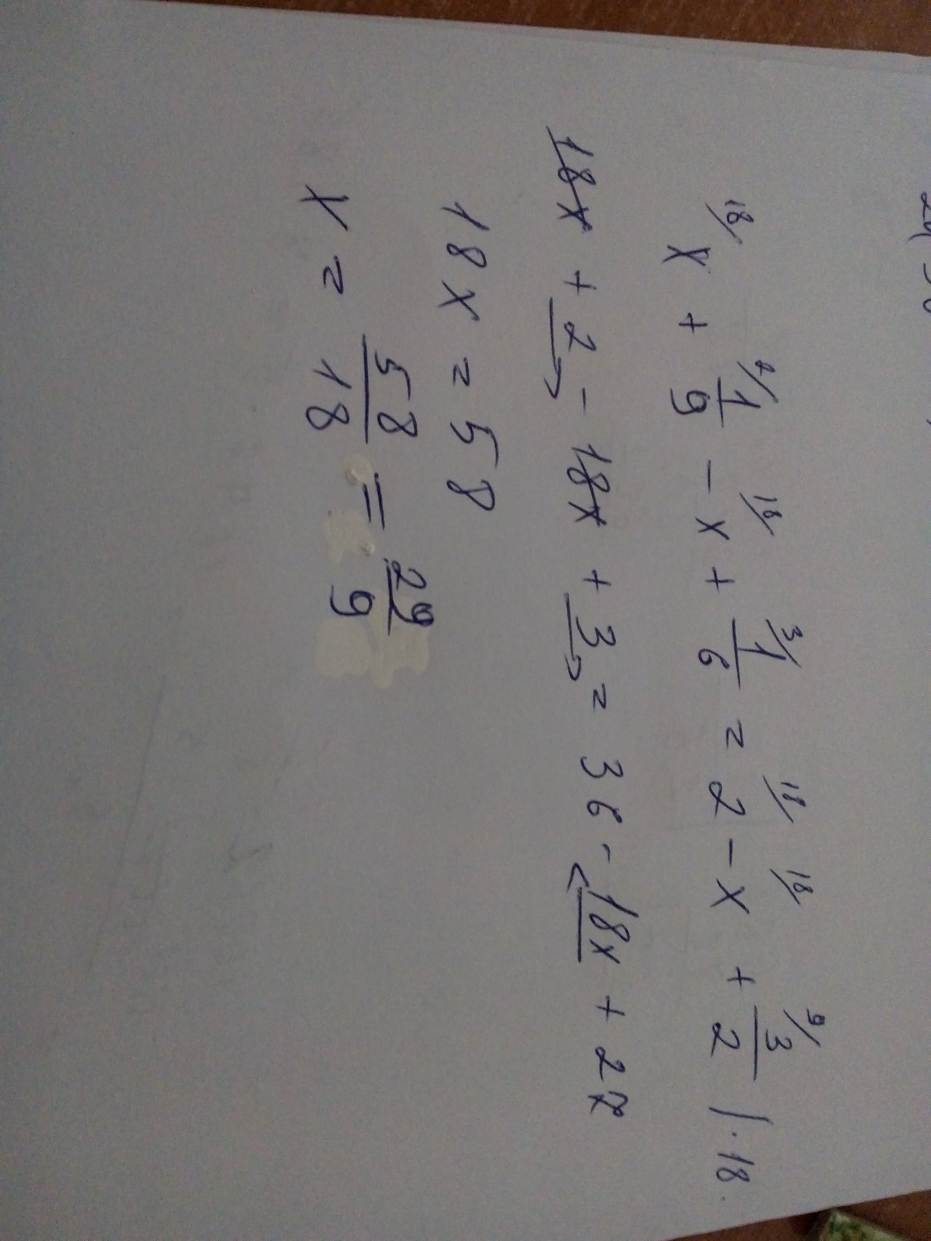 решил. вот так - x+1/9 - x-1/6 = 2-x+3/2 - умножим обе части на 18 => 2х + 2 - Зх + 3 = 36 - 9x - 27 => 2х - Зх + 9= 36 - 27 - 3 - 2 => 8x = 4 => x = 0,5.