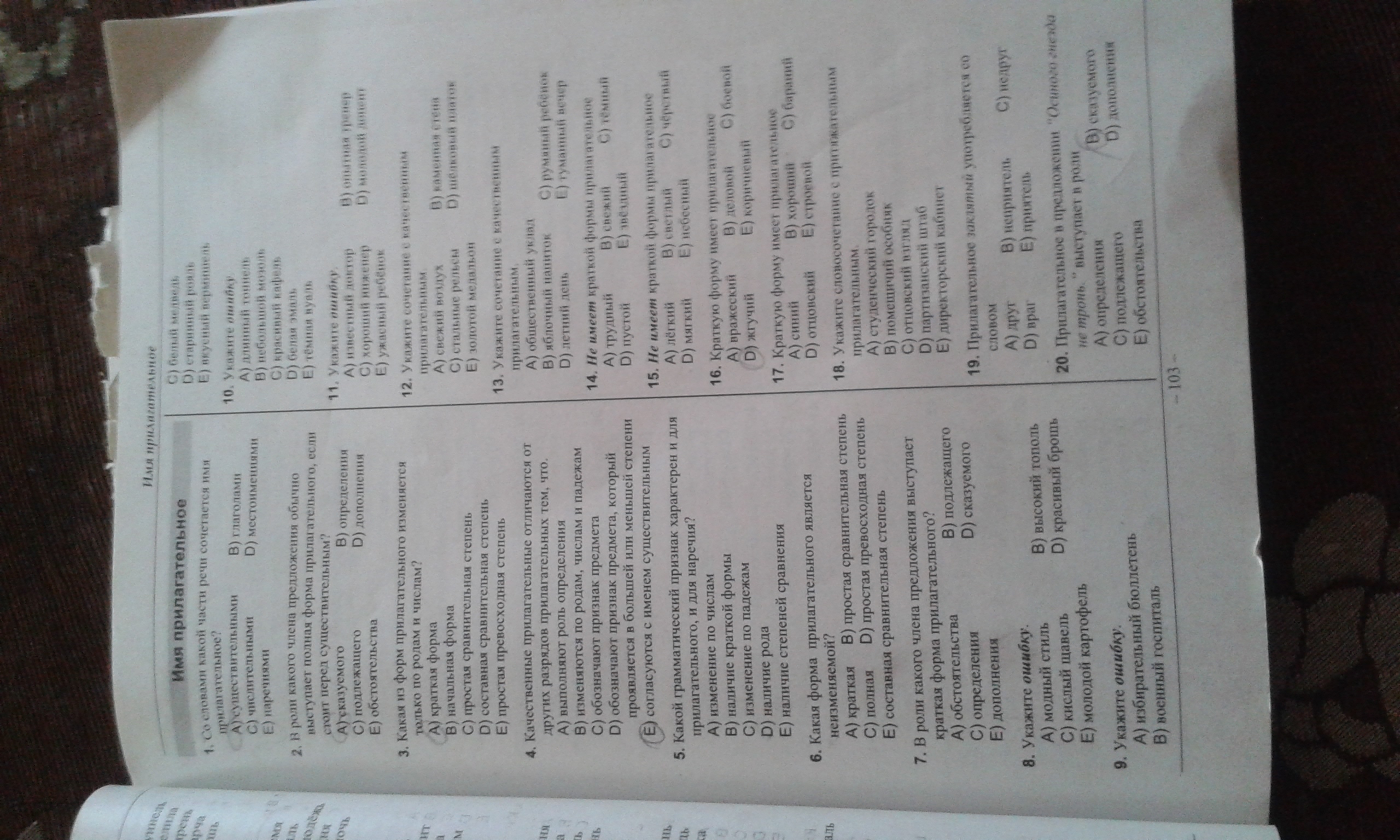 1.А (сущ.) 2 В (определение) 3.А (краткие) 4.Д (имеют большую и меньшу степень) 5. Е (есть сравнительные степени) 6 В (простая сравнительная) 7. Д (составное именное сказуемое) 8 Д (брошь ж.р) 9. Е (вермишель ж.р) 10. В (мозоль ж.р) 11. В (только в разговорной речи) 12 А (более свежий-кач. прилаг) 13. С (менее румяный -кач прил) 14. Е (по смыслу только, потому что все имеют) 15. Е (нет кр формы). 16. Е (коричнево) 17.В (хорош) 18. В (помещичий- принадлежность) 19. Д (заклятый враг) 20 А (определение)