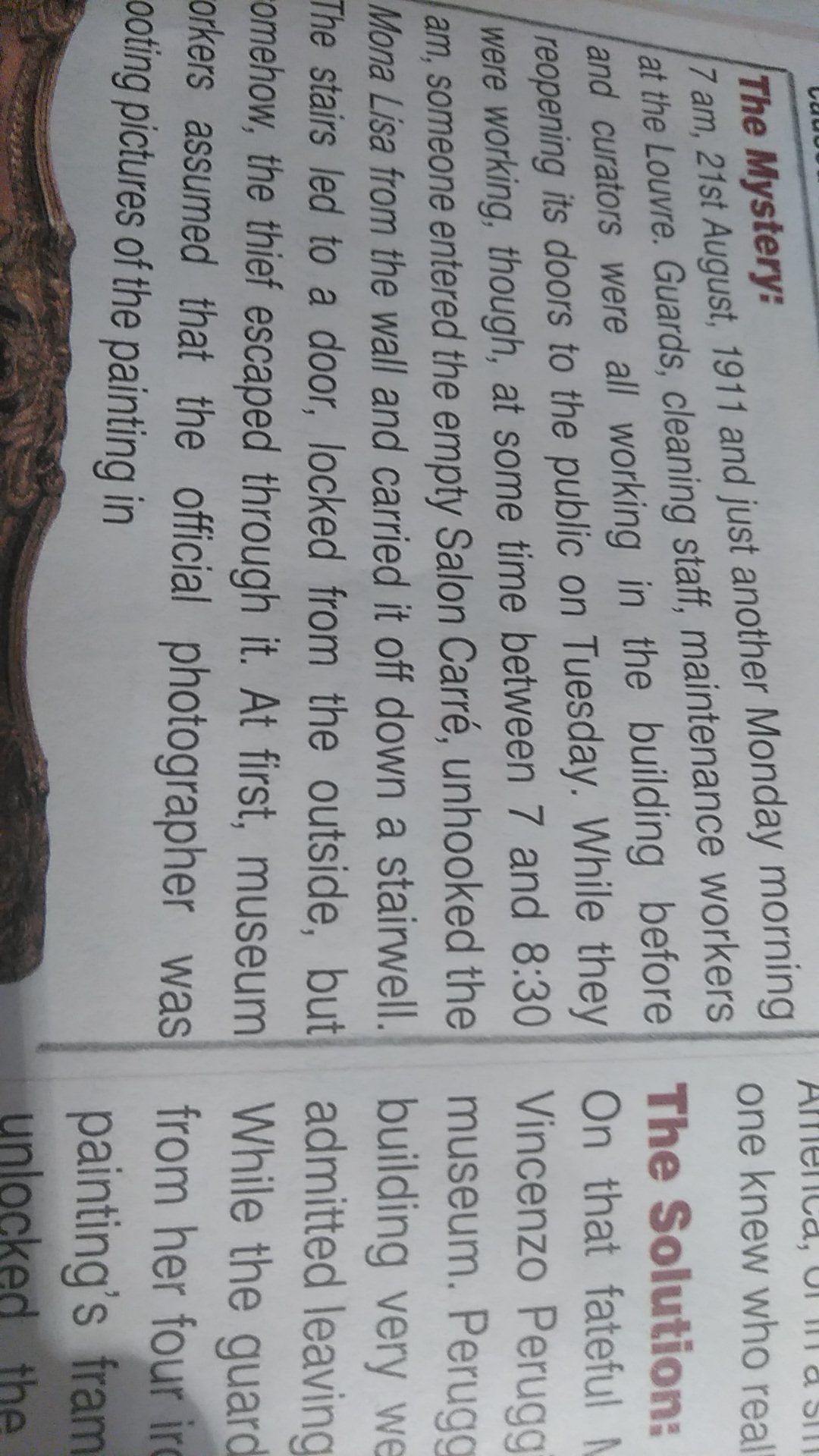 Тайна: другой понедельник утром 7 утра 21 августа 1911, и только подсобные рабочие в Лувре. Охранники, уборщики, и хранители все работали в здании, прежде чем открывает свои двери для публики во вторник. В то время как они работали, хотя, в какой-то момент между 7 и 8:30 утра, кто-то вошел в пустой салон Карре, отцепил Джоконду от стены и унес его вниз лестничной клетки. он по лестнице привела к двери, запертой снаружи, но omehow вор сбежал через него. Во-первых, музей KERS предположил, что официальный фотограф фотографии OFTHE ке живописи в