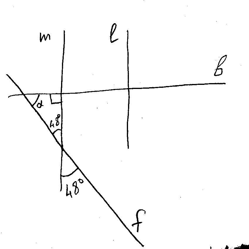 3. Прямые m и l параллейны, прямая b перпендикулярна прямой l, а прямая f пересекает прямую m под углом 48 градусов. Найдите угол между прямыми b и f