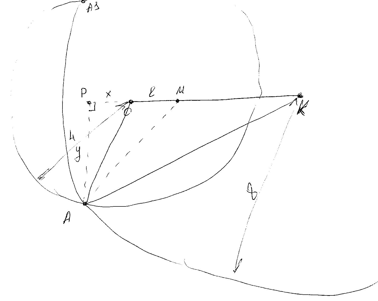 l -расстояние от т.О до ц. окр. М касающихся одновременно двух данных, т.е. в т.А и А1 (необходимо найти МА)