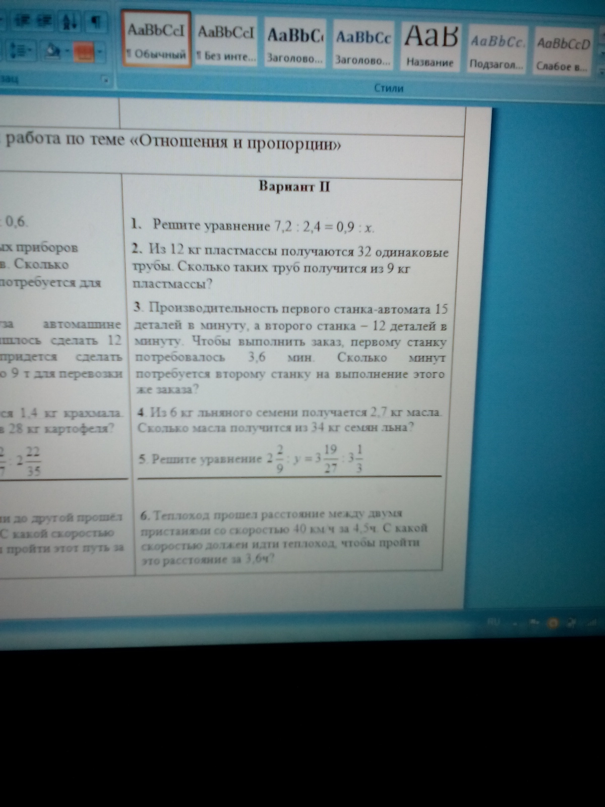 7,2 : 2,4= 0,9 : х