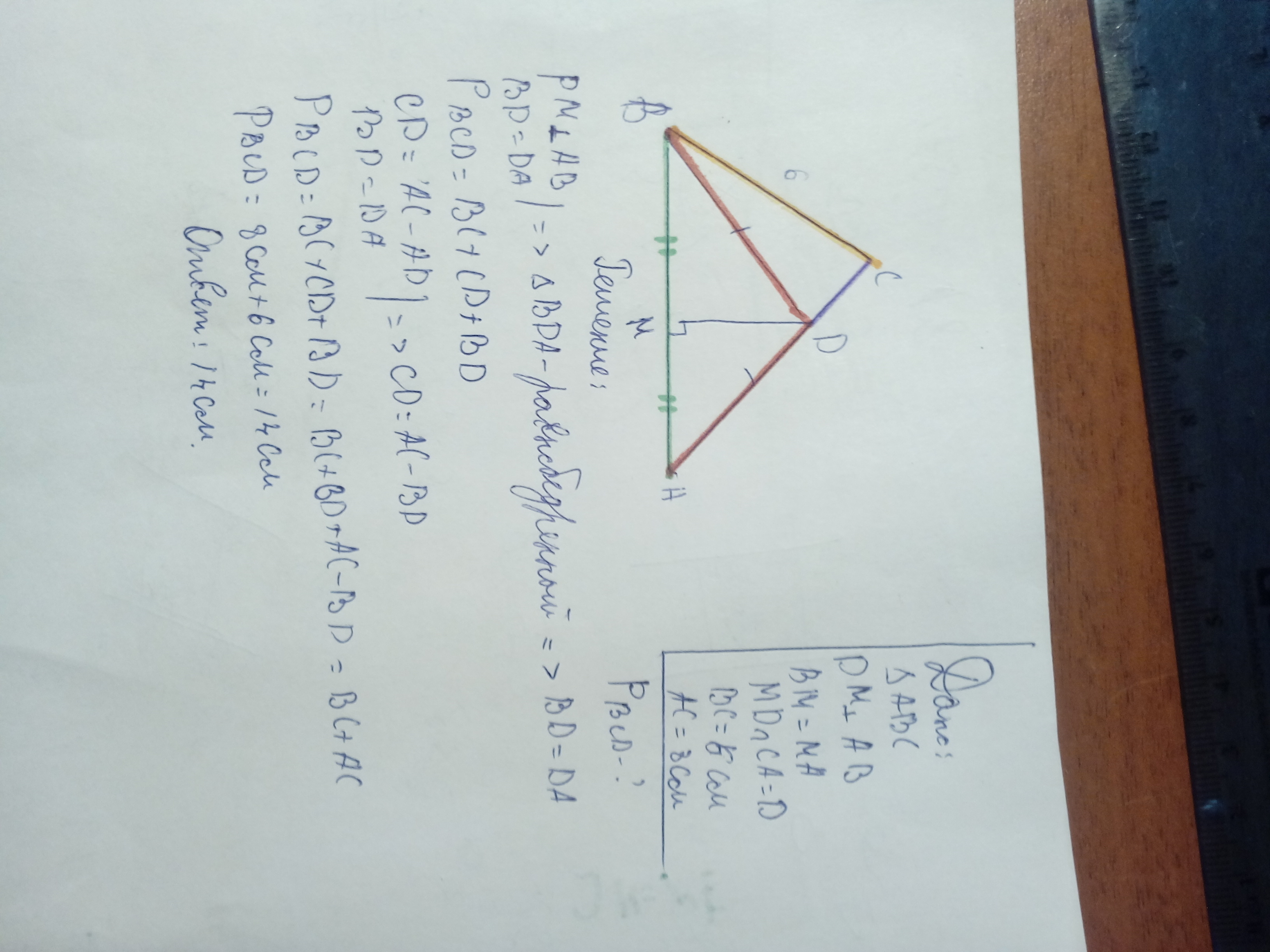 помогитееееееееее(((( Серединный перпендикуляр стороны АВ треугольника АВС пересекает сторону АС в точке D. Найдите периметр треугольника BDC, если АС=8см, ВС=6см. пожалуйста с чертежем!!!!!!!!! помогите пожалуйста))))))))))))))))))