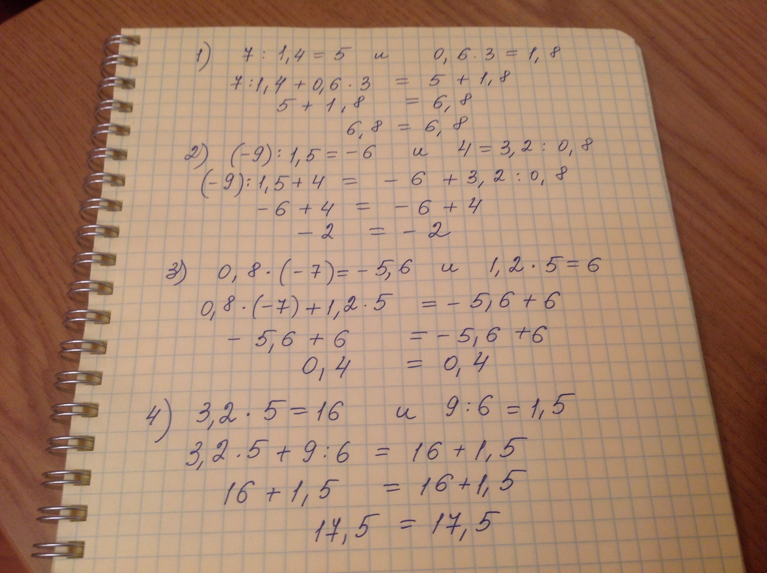 по математике номер 843 выполните почленное сложение верных числовых равенств 1) 7:1,4=5 и 0,6*3=1,8 2) (-9):1,5= -6 и 4= 3,2:0,8 3) 0,8*(-7) = -5,6 и 1,2*5=6 4) 3,2*5=16 и 9:6=1,5