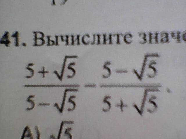 (5+√5)(5+√5)-(5-√5)(5-√5) :(5-√5)(5+√5)=25+10√5+5-(25-10√5+5):(5-√5)(5+√5)=(30+10√5-30+10√5):(5-√5)(5+√5)=20√5: 20=√5