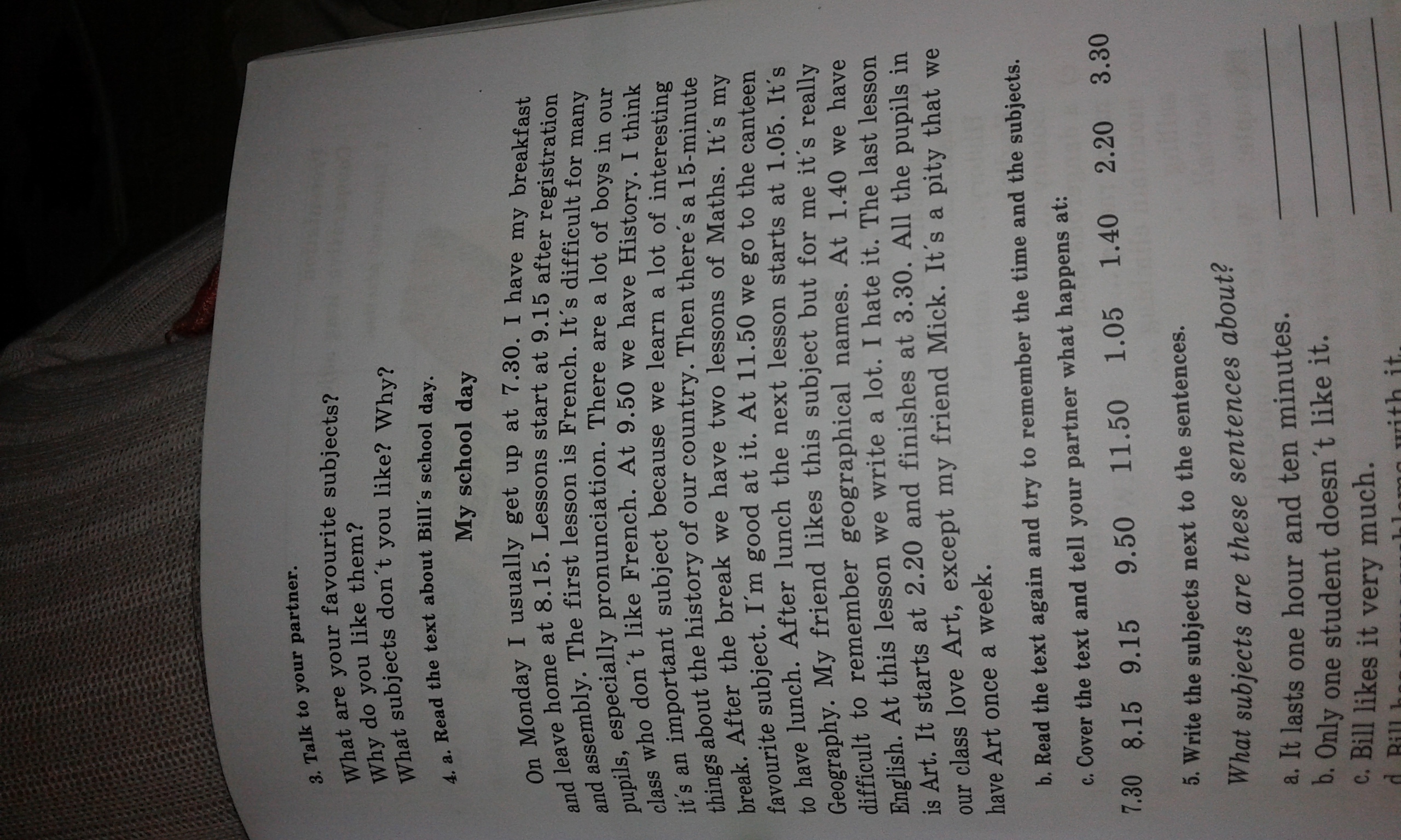 Обычно в понедельник я просыпаюсь в 7.30. Завтракаю и ухожу из дома в 8.15. Уроки начинаются в 9.15 после собрания и регистрации. Первый урок французский. Он сложен для многих учащихся. В нашем классе есть много мальчиков , которым не нравится французский. В 9.50 у нас история. Я считаю , это очень важный предмет , потому что мы учим много интересных событий истории нашей страны. Потом у нас 15 минутная перемена. После перемены у нас 2 урока математики. Это мой любимый предмет. Я хорош в нем. В 11.50 мы идем в столовую и обедает. После обеда следующий урок начинается в 1.05. Это географии .