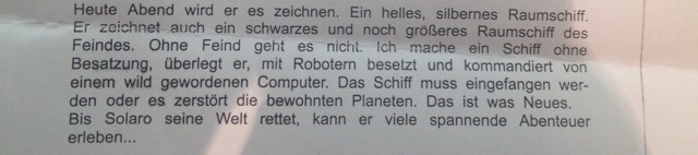 Сегодня вечером он нарисует его. Светлый, серебряный космический корабль. Он нарисует также черный и еще больший по размеру космолет врага. Без врага никак. Я сделаю корабль без экипажа, размышляет он, занятый роботами и отдающим команды одичавшим компьютером. Корабль должен быть захвачен или он разрушает обитаемые планеты. Это что-то новое. Пока Соларо не спасет его мир, он сможет пережить множество увлекательных приключений.