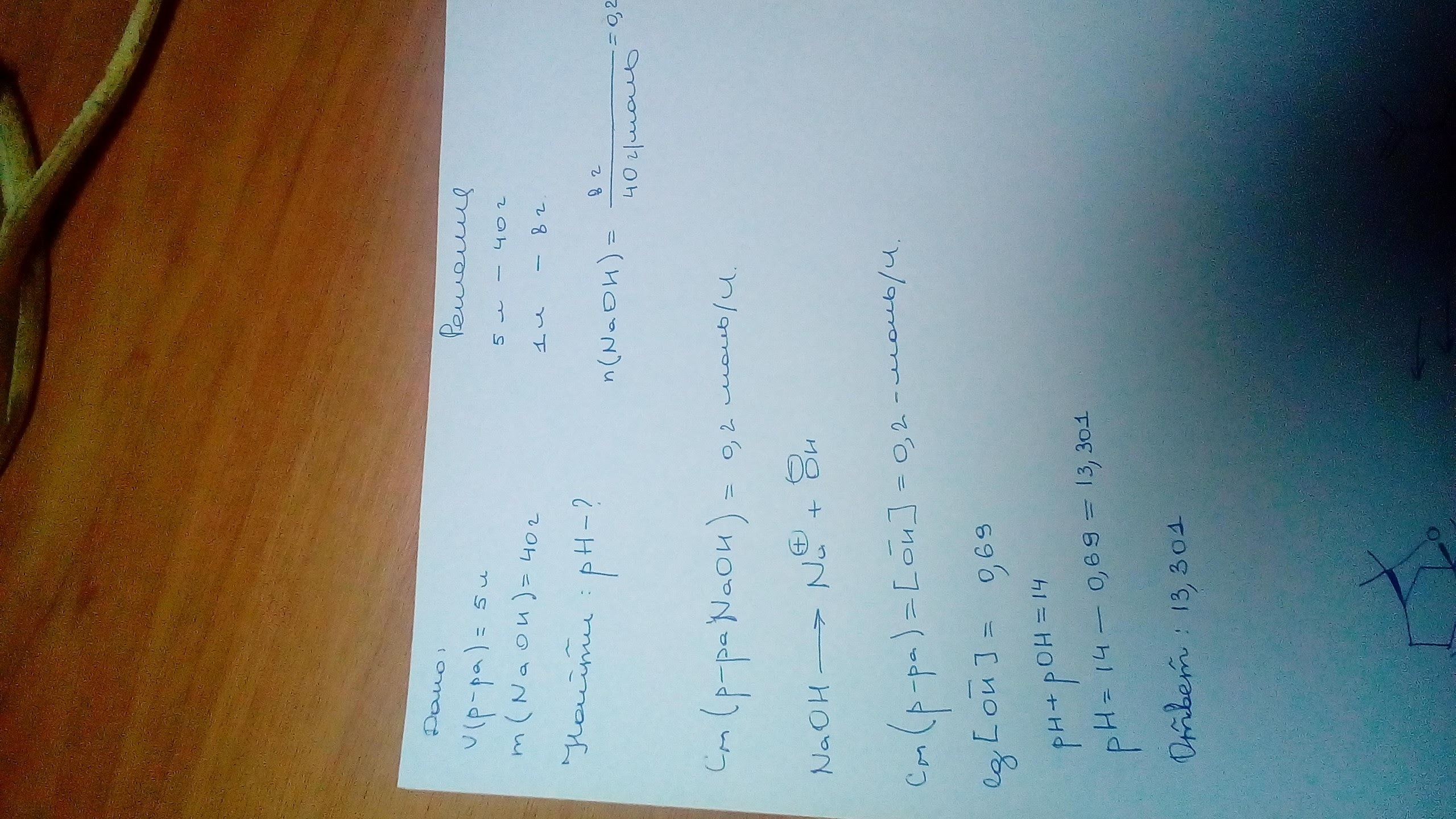 В 5 л воды растворили 40 г гидроксида натрия. Пренебрегая изменением объема и считая диссоциацию гидроксида натрия полной, определите рН полученного раствора.