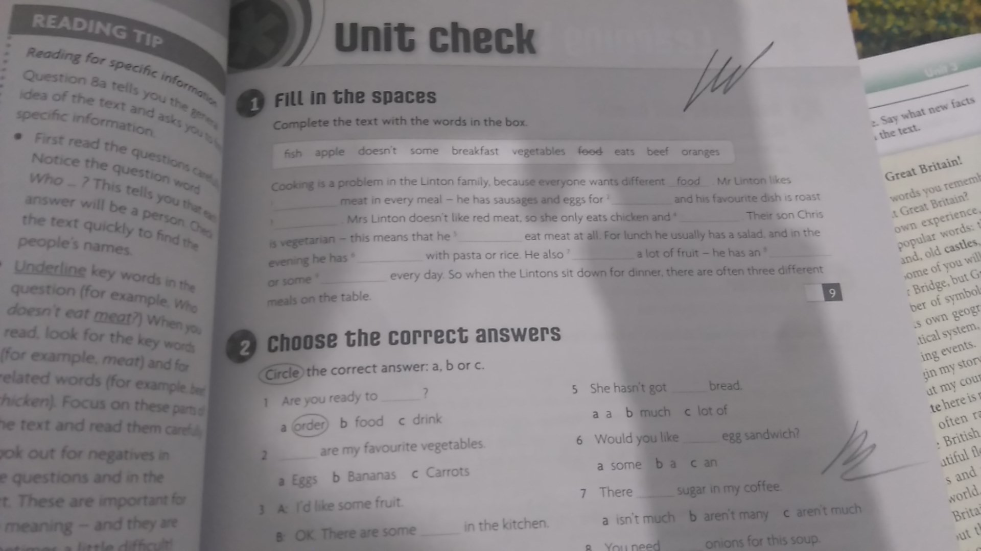 1)some 2)breakfast 3)beef 4)fish 5 )doesn't 6)vegetables 7)eats 8)apple 9)oranges я так поняла второе упражнение не надо? номер 2:2)c 3)и 4) не видно, 5)b 6)c 7)a 8)не видно. вот так)